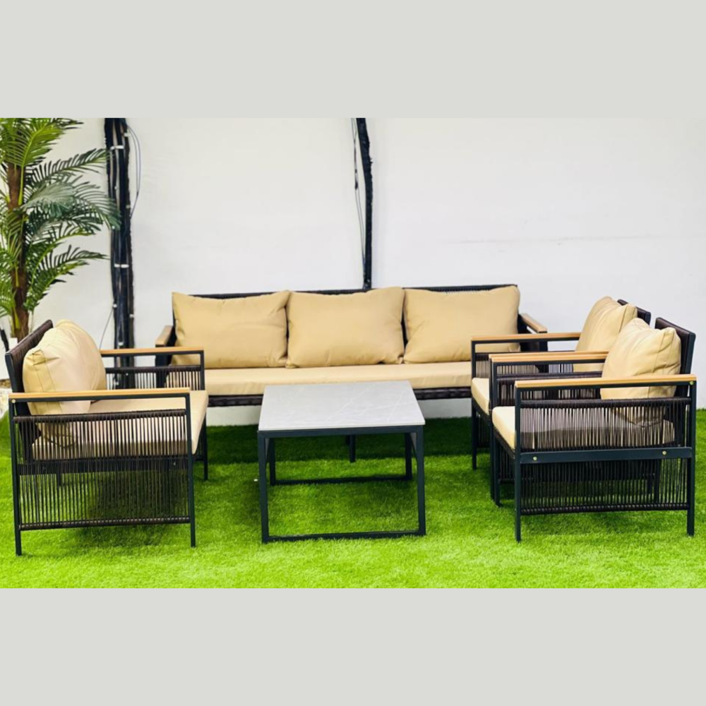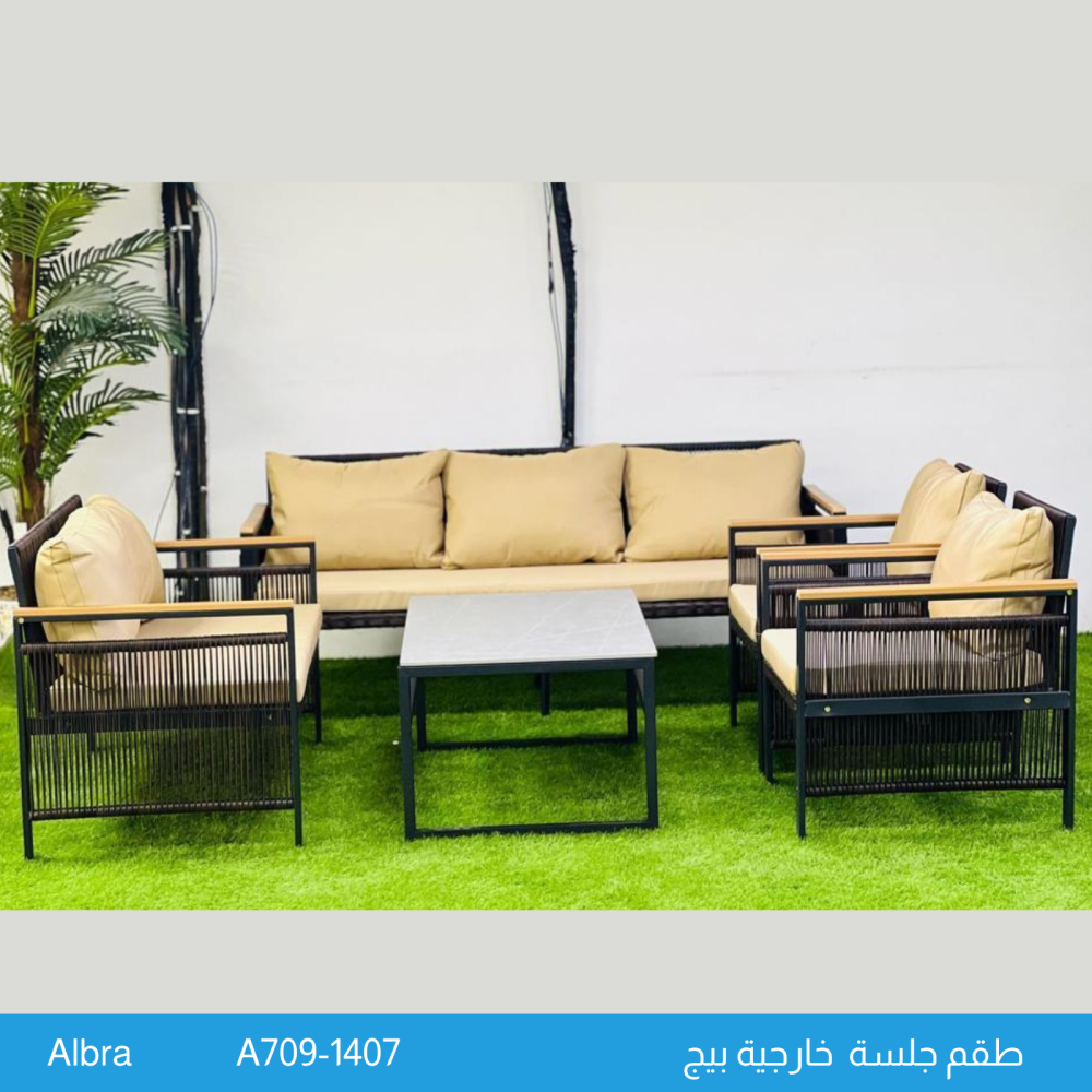 من أجمل تصاميم اطقم الجلسات الخارجية التي نقدمها لكم في متجر ستار هومي هو هذا الطقم المصمم ل7 اشخاص والمؤلف من مجموعة من الكراسي والكنب المزودة بحوامل معدنية مقاومة للعوامل الجوية بالإضافة لوسائد مقعد ومسند ظهر توفر الراحة أثناء الجلوس، كما يأتي مع الطقم طاولة وسط مستطيلة.