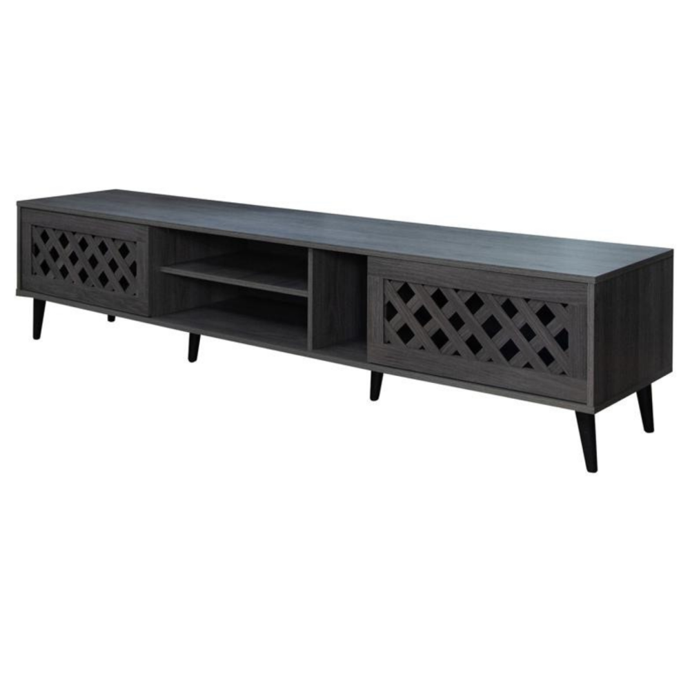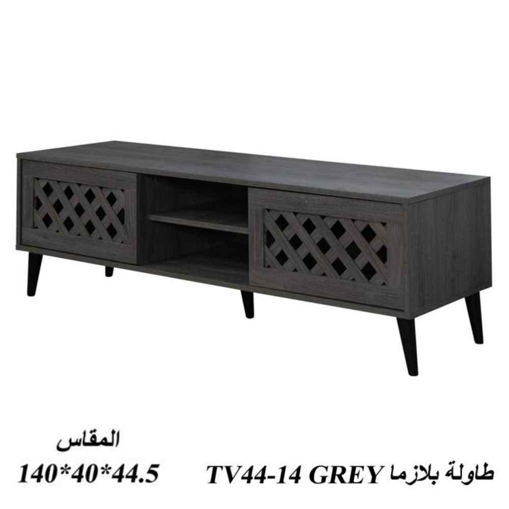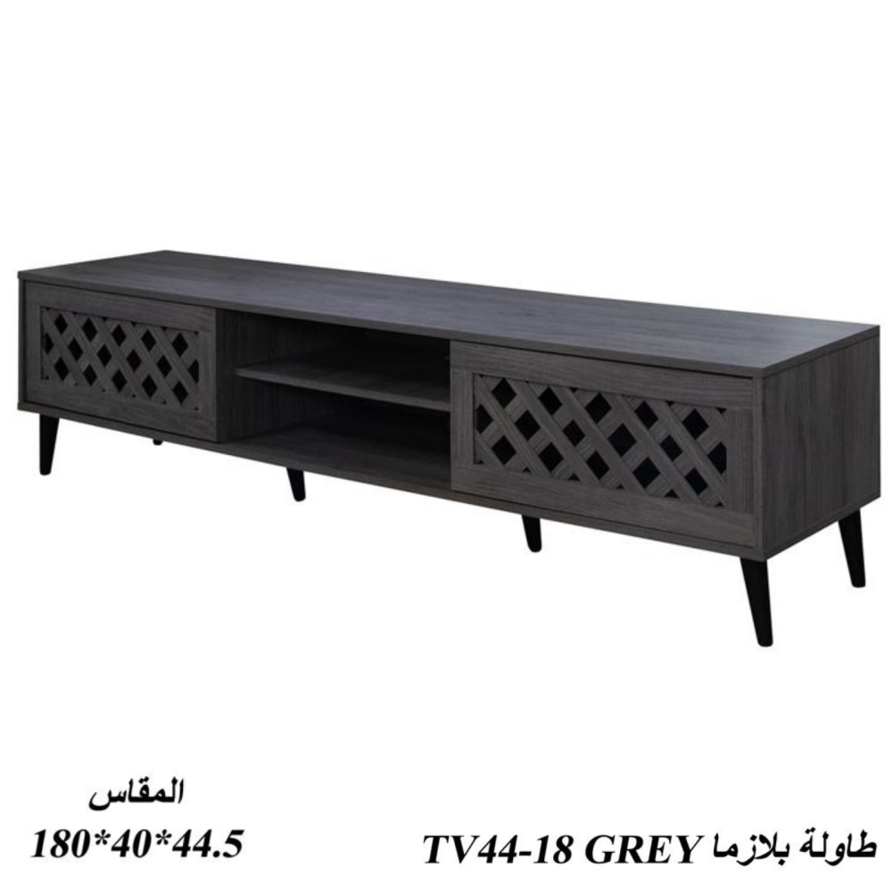 الفخامة، الأناقة والرقي تتمثل في تصميم طاولة البلازما هذه المصنوعة من أجود المواد المتينة المقاومة للخدش والمزودة بأرجل معدنية مقاومة للكسر والاهتراء، هذه الطاولة مزودة بخزن جانبية مزينة بقضبان مائلة بشكل معينات متجاورة تضفي لمسة هندسية مميزة للتصميم.