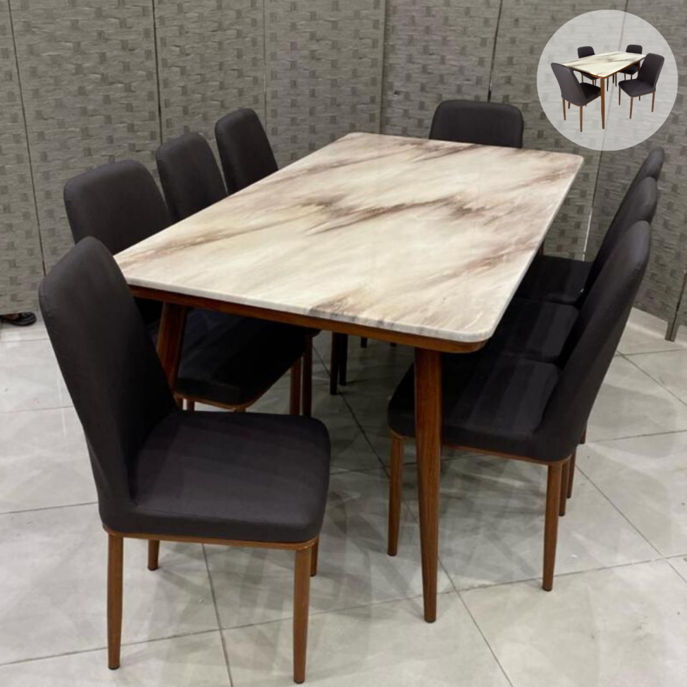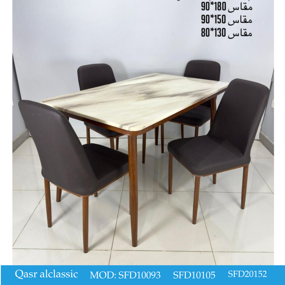 من أجمل تصاميم اطقم طاولات الطعام التي نوفرها لكم في متجر ستار هومي، هو طقم طاولة الطعام هذا المؤلف من طاولة مصنوعة من الرخام الطبيعي بتصميم مستطيل مزينة بتموجات لونية تضفي لمسة من الفخامة، ومجموعة من الكراسي المصنوعة من أجود الخامات المبطنة بطبقة من الإسفنج الطري.