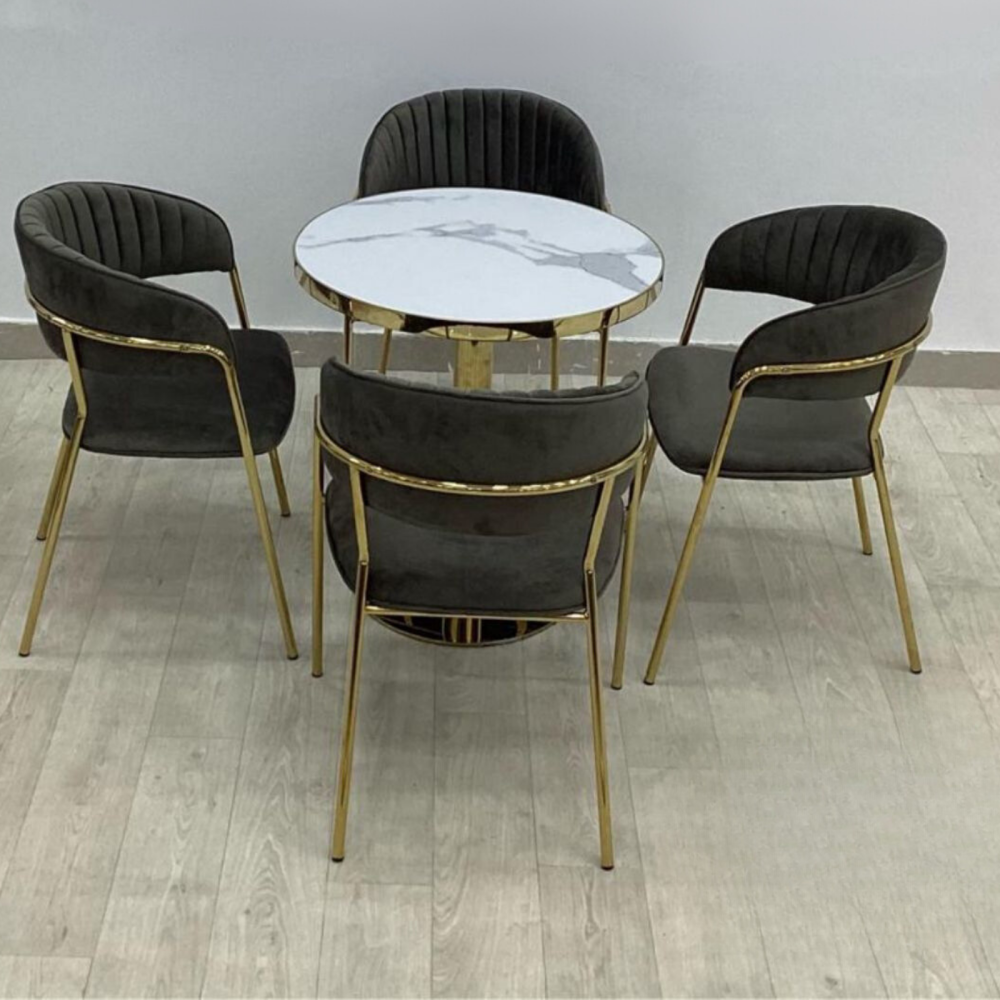 طقم جلسة مصممة لاربعة اشخاص مؤلفة من طاولة دائرية وأربعة كراسي مزودة بمقعد ومسند ظهر منحني للأمام، الطاولة والكراسي مصنوعة من الستانلس ستيل بلون ذهبي يضفي لمسة من الفخامة للتصميم، هذا الطقم مناسب للمقاهي والمطاعم والمنتجعات ذات الطابع الفخم.
