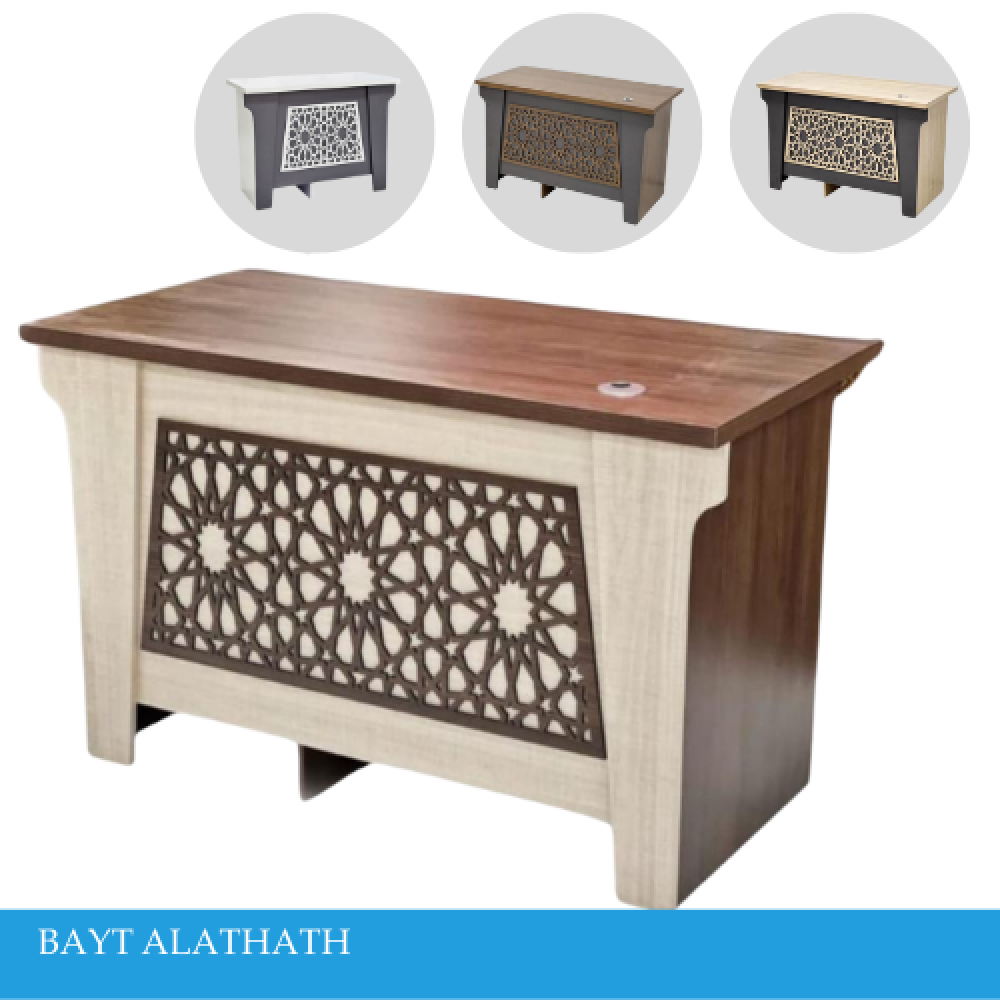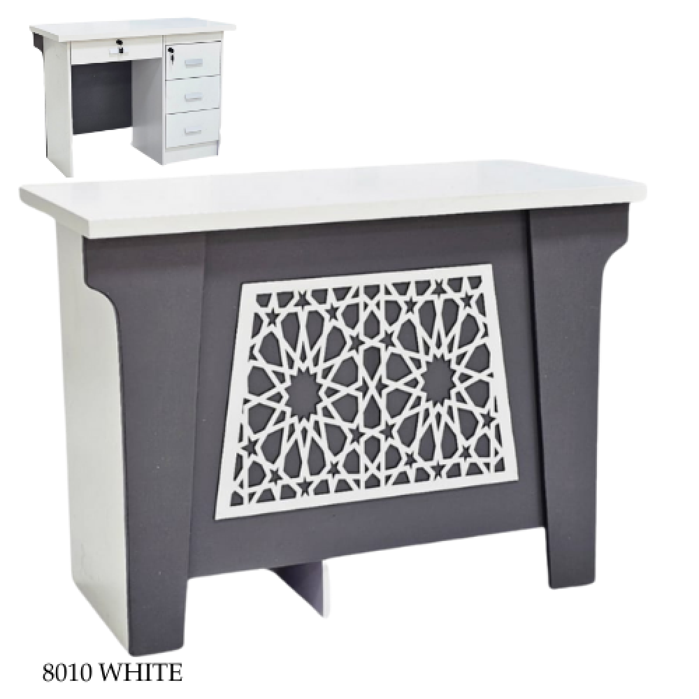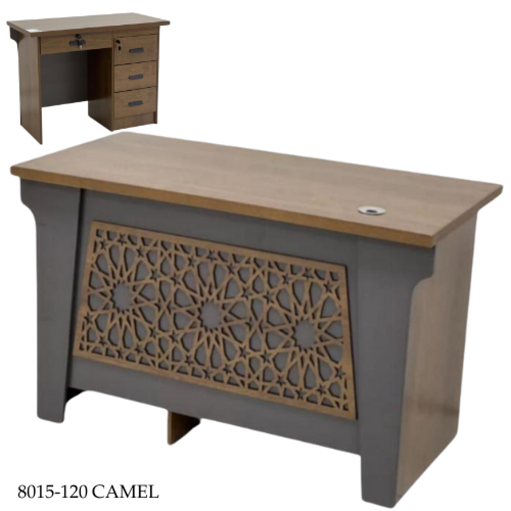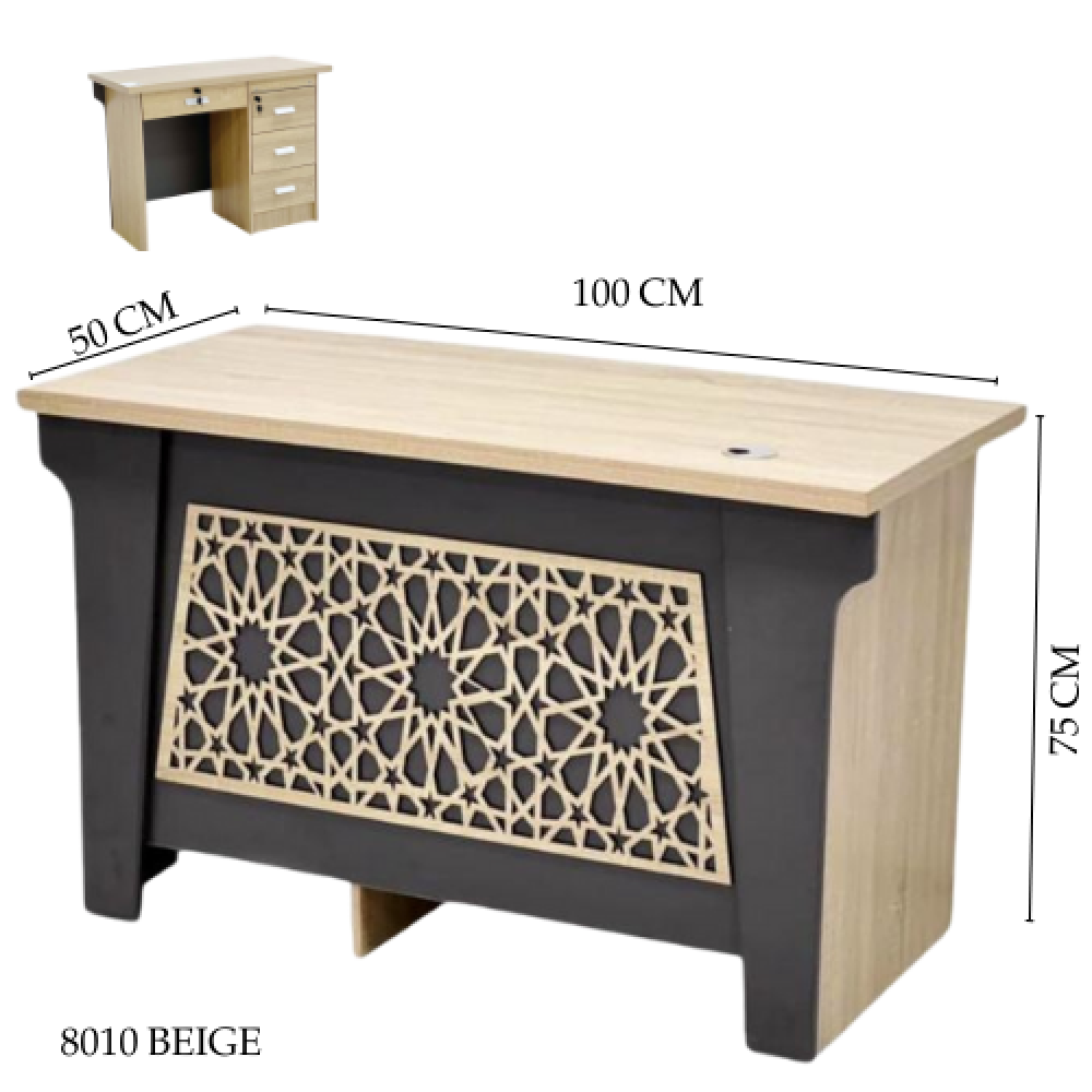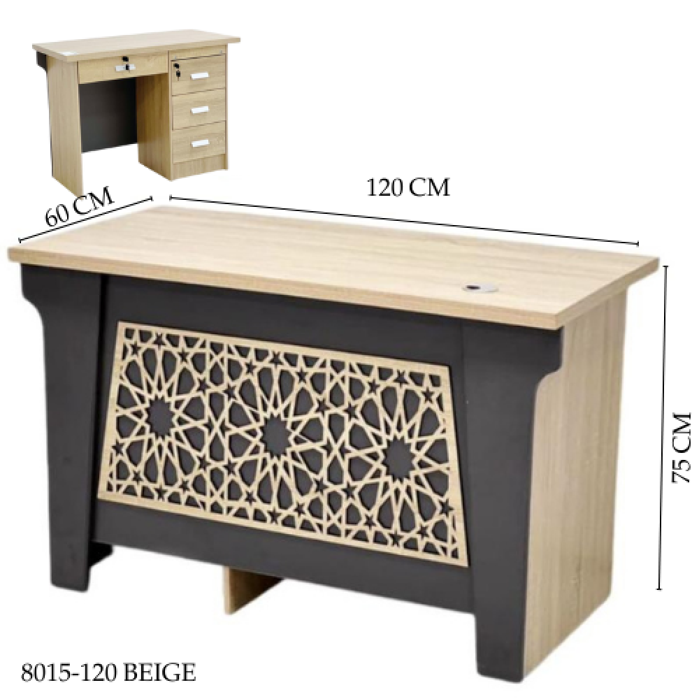 مكتب عمل انيق ومميز بتصميم عملي يوفر الراحة أثناء تنفيذ الأعمال في مكتب العمل أو المنزل، مزود بأدراج توفر مساحة تخزين إضافية لأوراق ومستندات العمل، ومزين في الجهة الأمامية بزخرفة أنيقة تضفي لمسة من الفخامة للتصميم، هذا المكتب متوفر بقياسين وعدة ألوان.
