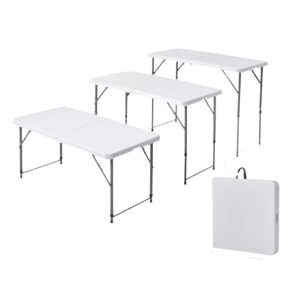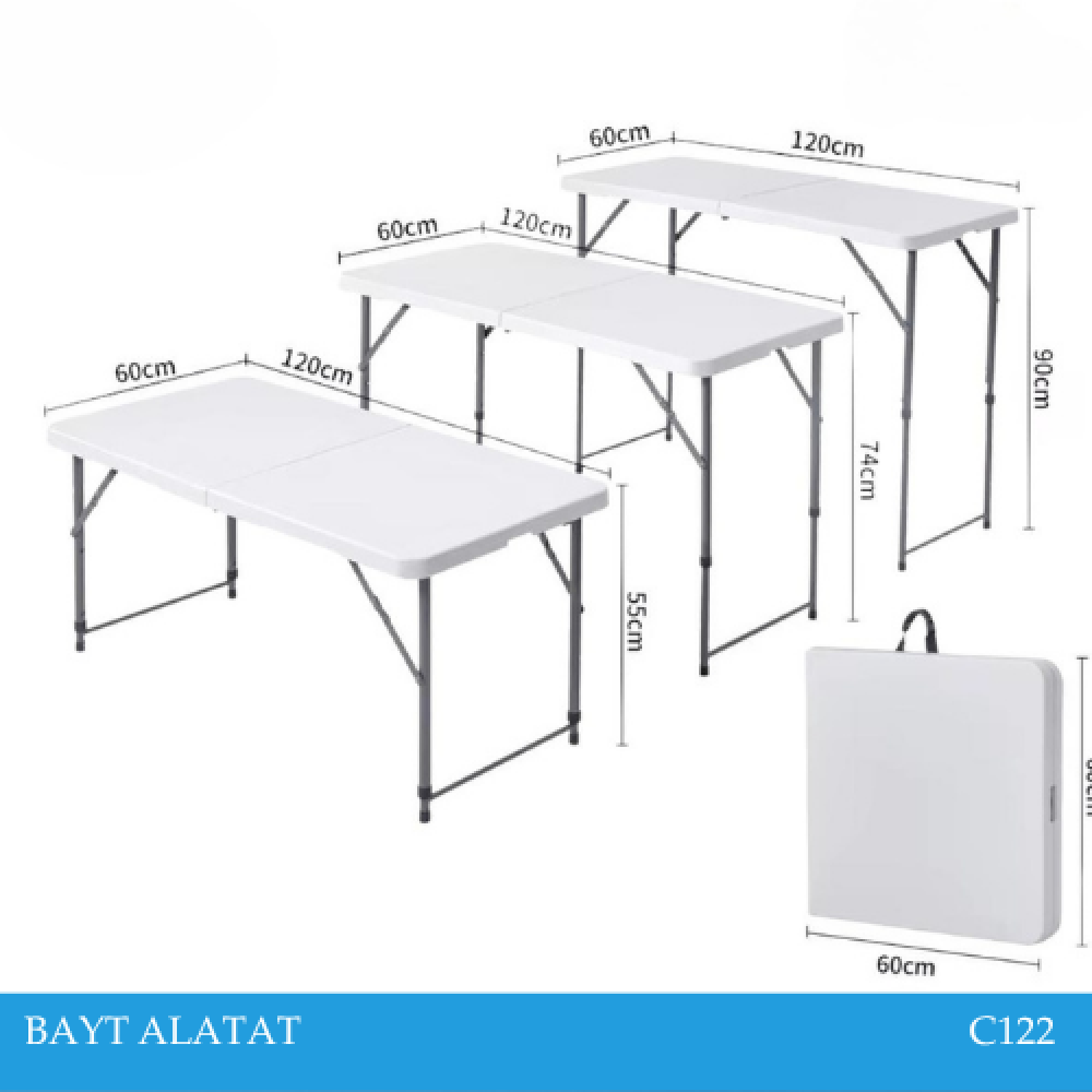 طاولة عملية مصنوعة من الفايبر المتين، قابلة للطي والتحويل إلى شكل شنطة بحجم مدمج يسهل حملها وتخزينها. تأتي بمقاس 120×60 سم مع أرجل قابلة لتعديل الارتفاع على ثلاث مستويات (55 – 74 – 90 سم)، مما يجعلها مثالية للاستخدام في الرحلات، التخييم، المناسبات العائلية أو حتى داخل المنزل. تصميم عملي يوفر لك الراحة والمرونة في كل مكان.