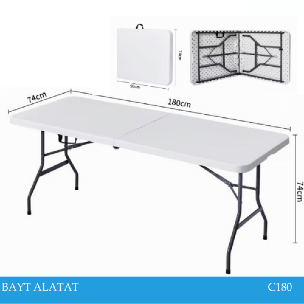 طاولة فايبر مستطيلة قابلة للطي، بمقاس 180 سم عرض × 74 سم طول × 74 سم ارتفاع، باللون الأبيض الصافي. تصميم مدمج عملي وسهل الاستخدام، مثالية للاستخدام الخارجي أو الداخلي، مثل المناسبات، الحفلات، الشرفات، أو كطاولة مؤقتة عند الحاجة، ثم طيها لتخزينها بسهولة.