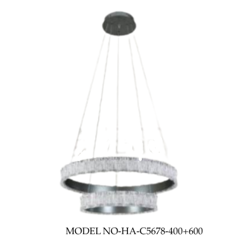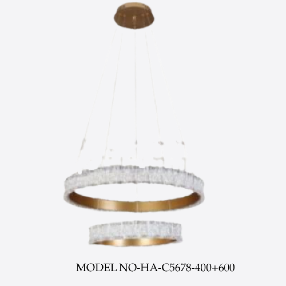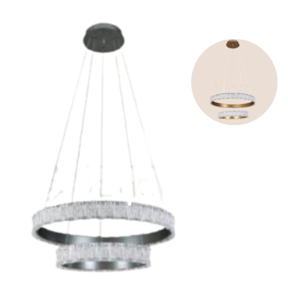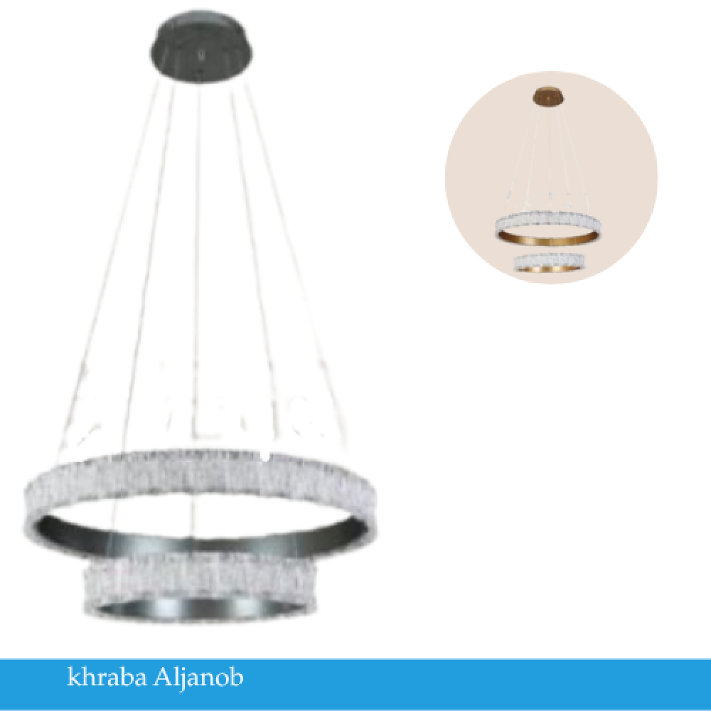 ثريا مودرن بألوان متعددة (ذهب، أسود) بتصميم مزدوج مع حلقات (400 مم و600 مم)، تمنح إضاءة متوازنة وأنيقة. تأتي بتفاصيل كريستالية لامعة تضيف لمسة فاخرة لكل غرفة. وهي مثالية للمساحات الكبيرة مثل الصالونات أو المكاتب الفاخرة. متوفرة باللون الذهبي والأسود