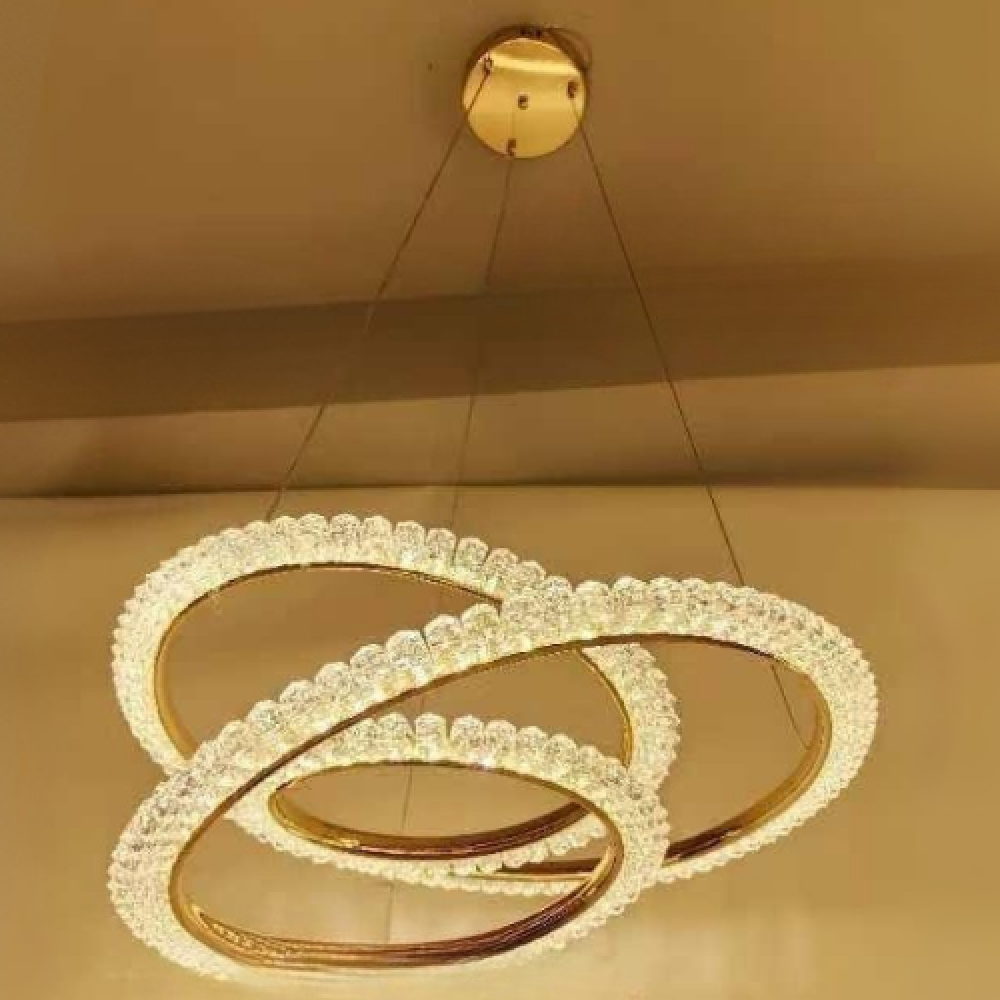 إذا كنت تبحث عن لمسة فاخرة وأناقة بلا حدود، فهذه الثريا مصممة لتخطف الأنظار! ثلاث حلقات كريستالية متداخلة بإضاءة دافئة تبعث البهجة في قلب المكان، وتنعكس بروعة على الجدران والأسقف. مثالية لغرف المعيشة، المجالس، أو حتى صالات الاستقبال الفخمة. بتصميم عصري مفعم بالفخامة، تضيف هذه الثريا طابعًا ملكيًا لكل زاوية تعلق فيها