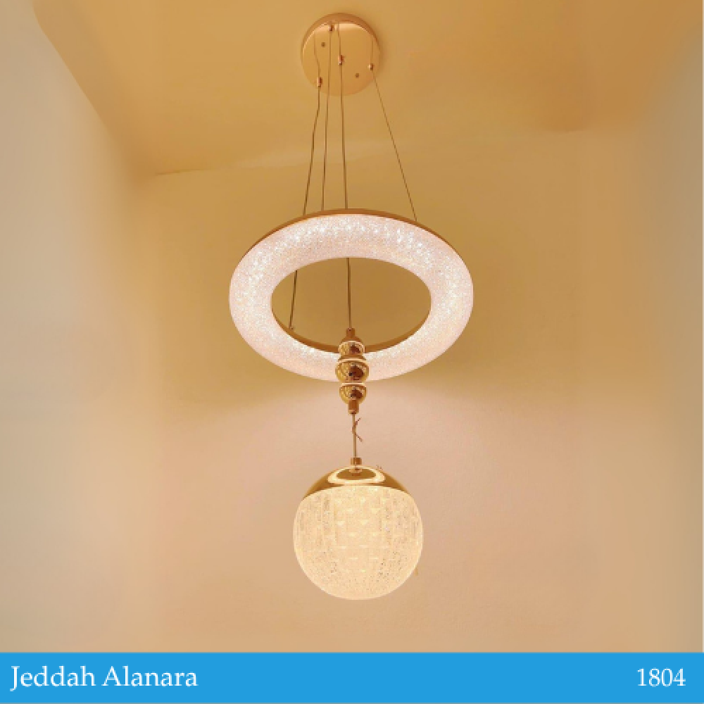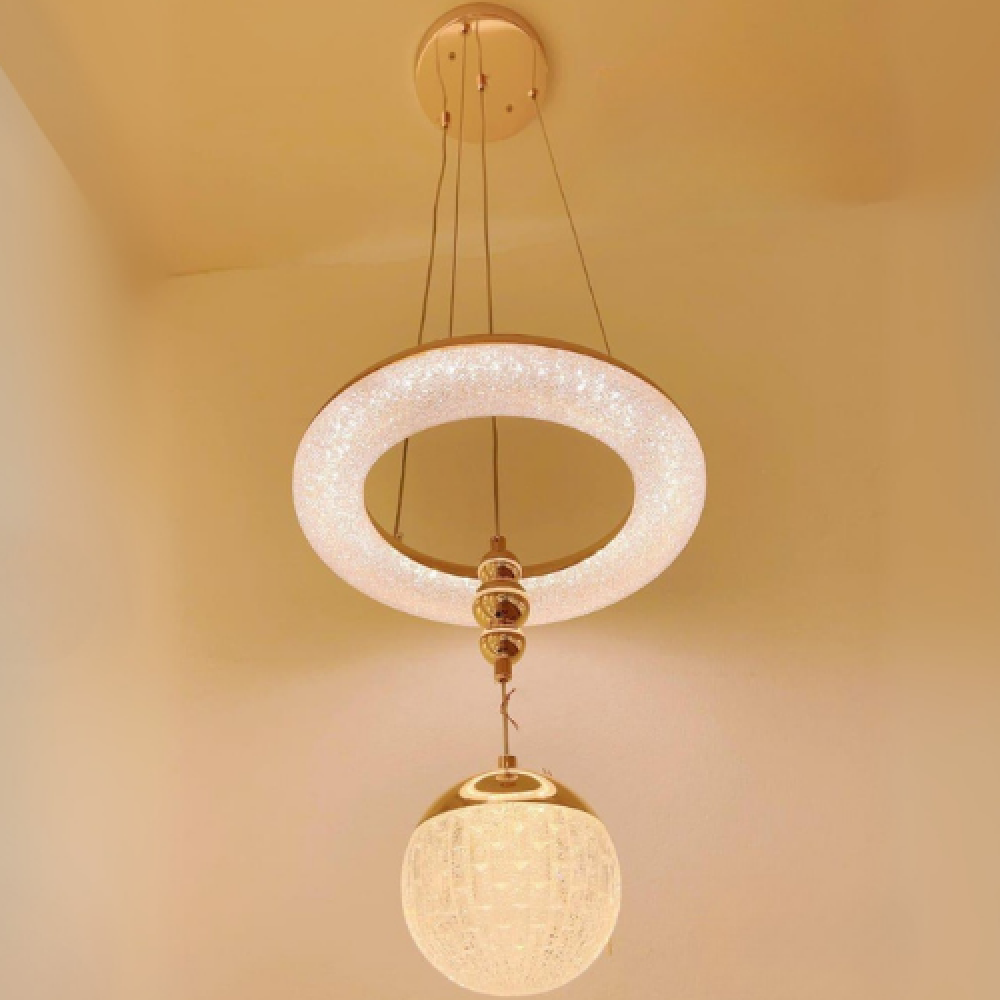 كل لمعة فيها تقول "أنا الأناقة"! ثريا بتصميم دائري راقٍ مع كرة بلورية متدلية تُضفي لمسة ملكية على المكان. تجمع بين الإضاءة الهادئة والتصميم العصري بلون ذهبي أنيق. مثالية للطاولات، الزوايا الفخمة، أو حتى في مدخل البيت لتقول لضيوفك: "هنا الذوق يبدأ!"