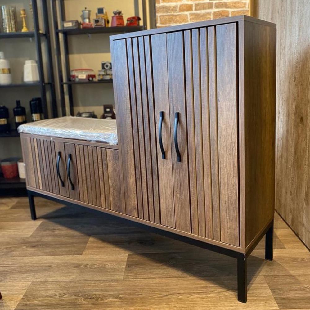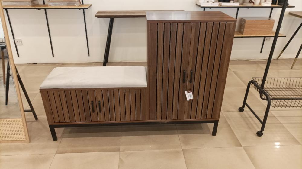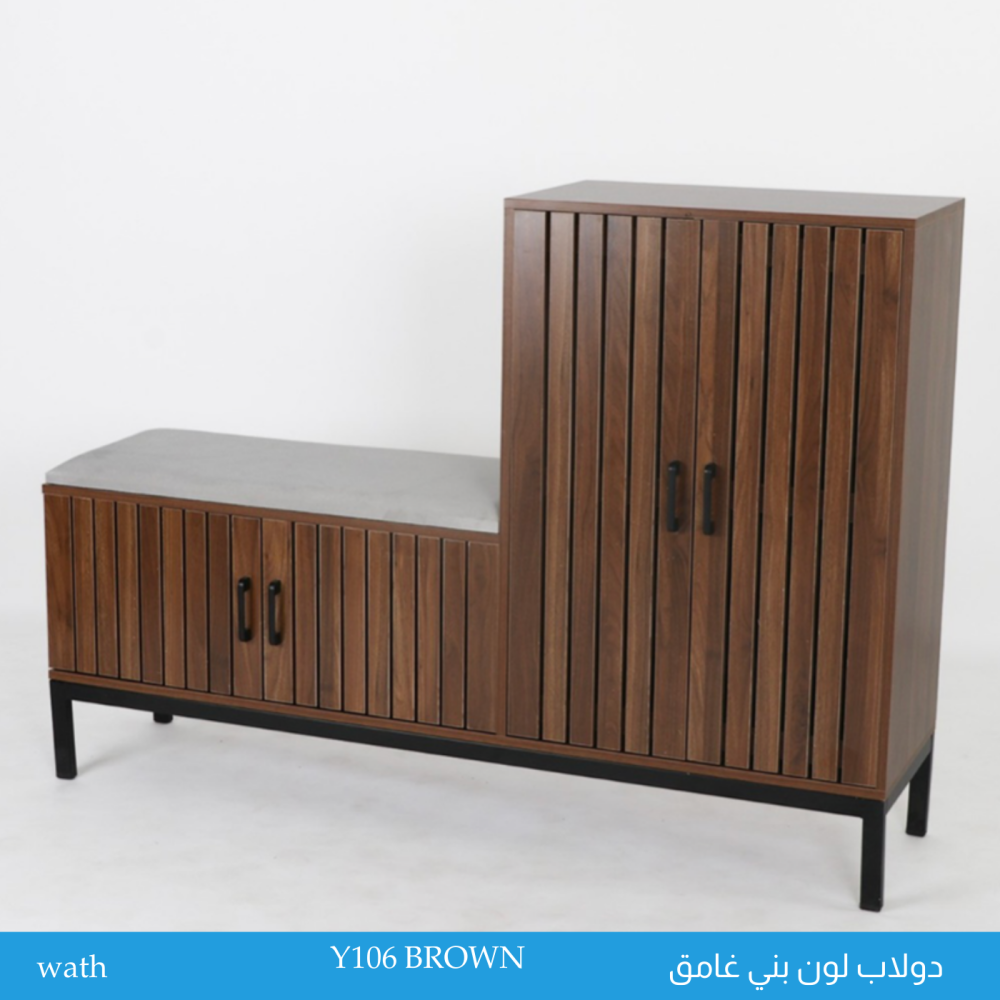 من أجمل تصاميم دواليب الأحذية وأكثرها عملية هو هذا الدولاب المميز بتصميم راقي يعكس فخامة المحيط والمزود بخزانتين لتطبيق الأحذية بالإضافة لجلسة على طرف الدولاب لتوفير الراحة والسهولة في ارتداء الحذاء وبالتالي لن تحتاجي سيدتي لكرسي في مدخل المنزل.