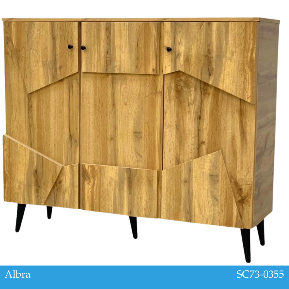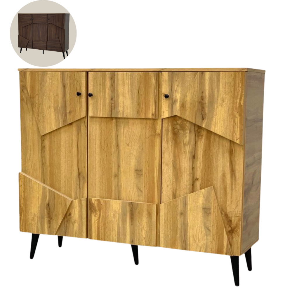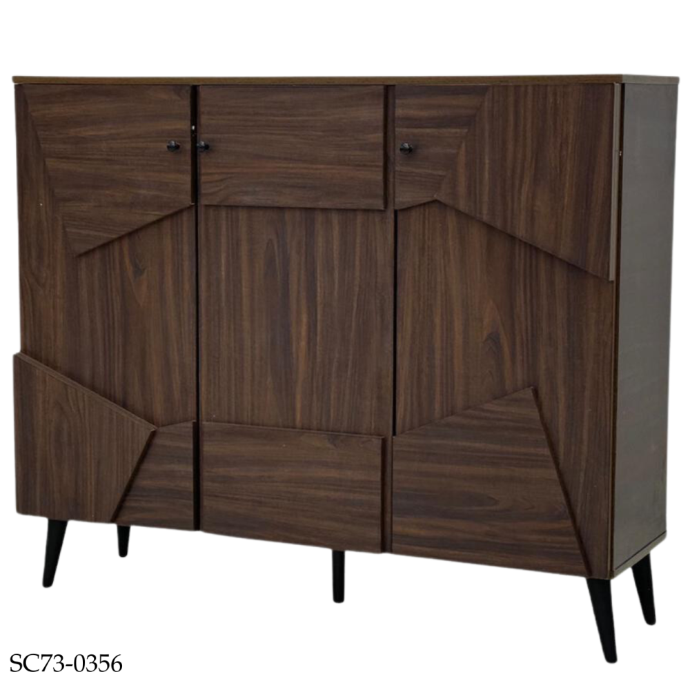 دولاب مميز بتصميم حديث يضفي لمسة من العصرية لديكور مدخل المنزل أو غرفة الطعام، مزود بعدة رفوف داخلية توفر مساحة تخزين واسعة، الأبواب مزينة بتصميم متدرج الارتفاعات مما يضفي لمسة ثلاثية الأبعاد فخمة، الدولاب محمول على أرجل معدنية متينة ومطلية باللون الأسود.