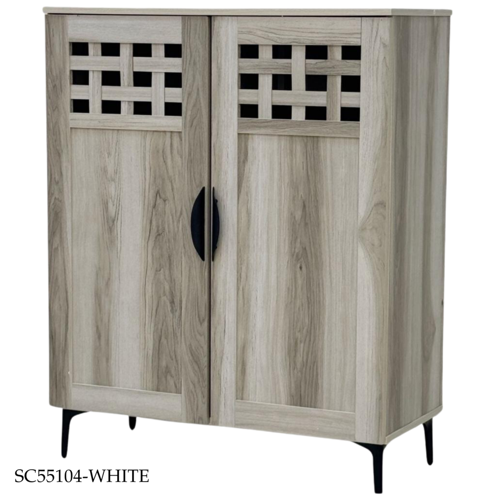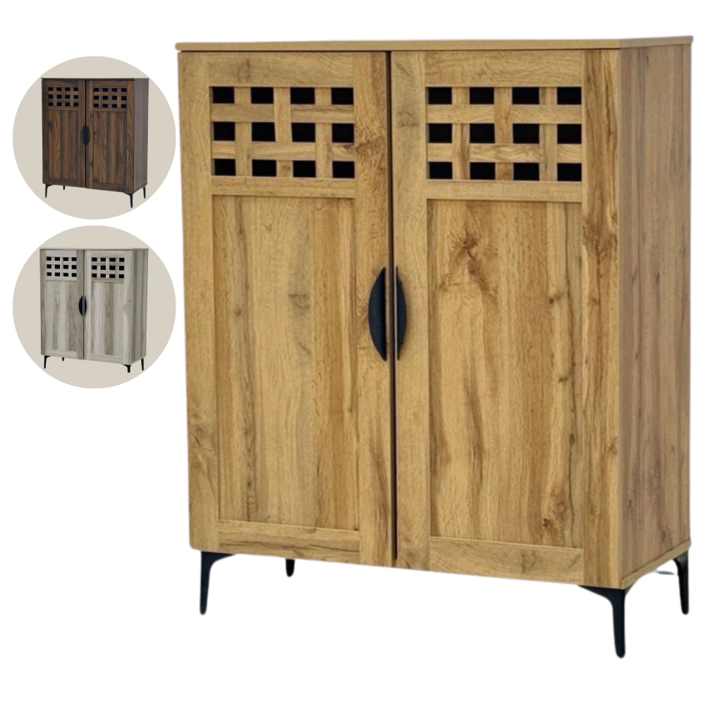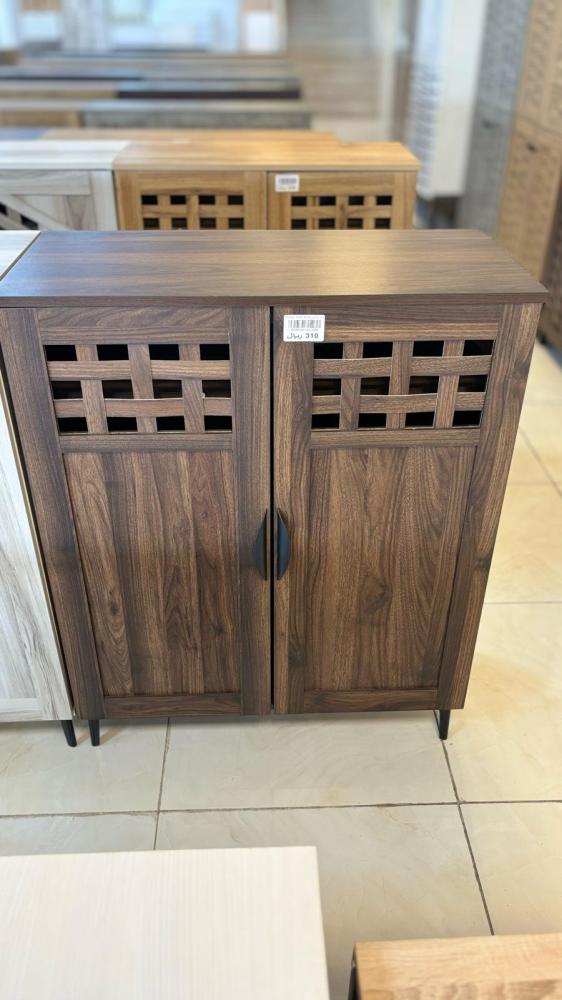 دولاب جزامة مصنوع من مواد فخمة ومزود بأرجل معدنية مطلية باللون الأسود توفر الثبات والمتانة للدولاب، يتميز بأبواب مزينة بمربعات مفرغة تضفي لمسة من التميز والفخامة للتصميم، ومزود برفوف داخلية توفر مساحة واسعة لتطبيق الأحذية وتنسيقها.