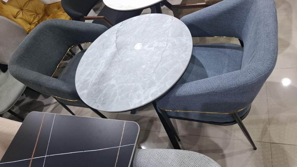طاولة طعام وكوفي شوب مزودة بسطح دائري مصنوع من البورسلان الفخم المميز بتموجات لونية ناعمة، ومزودة بحامل متين مصنوع من مواد مقاومة للكسر، هذه الطاولة مناسبة للجلسات الداخلية أو الخارجية في حديقة المنزل أو المطاعم ذات الطابع العصري الحديث.