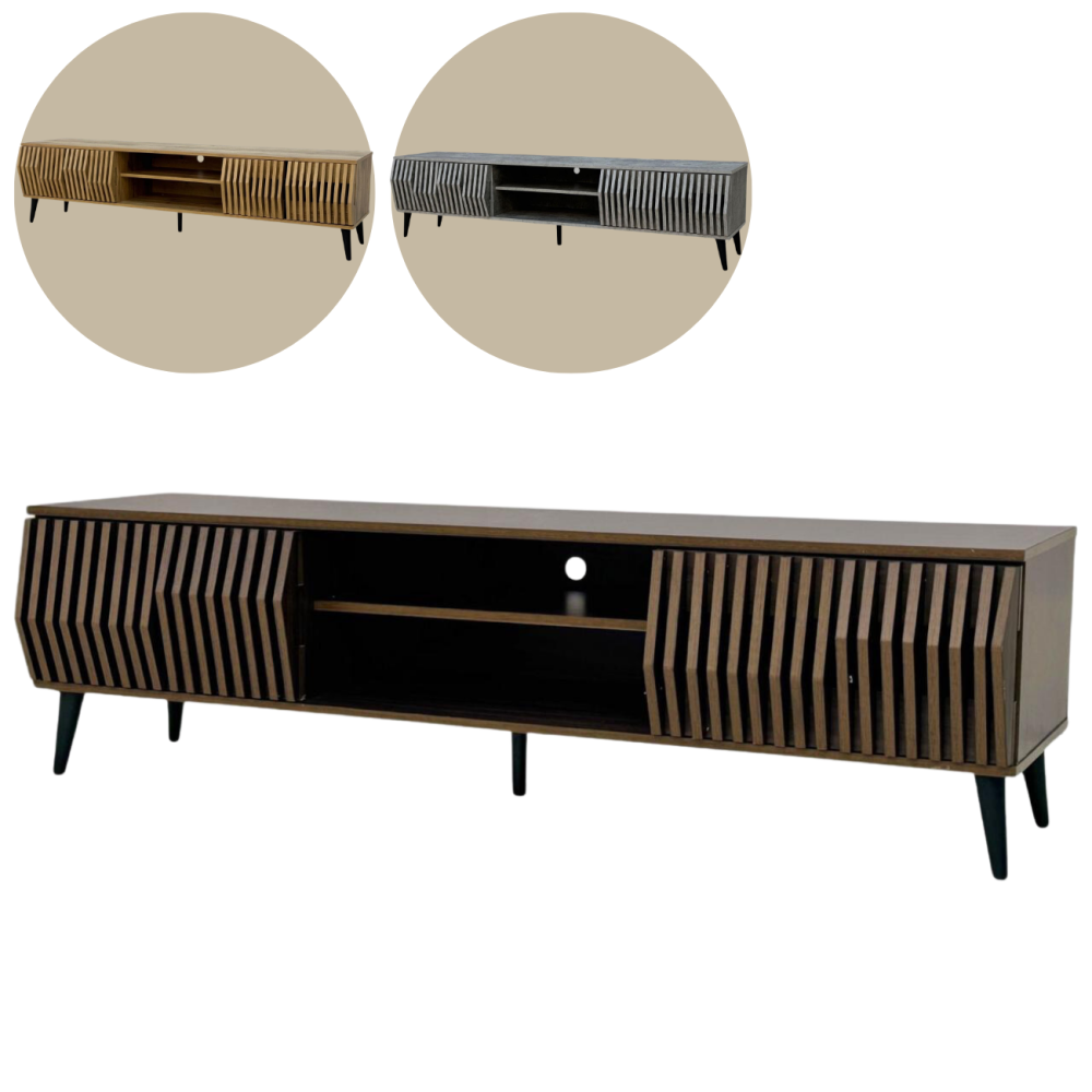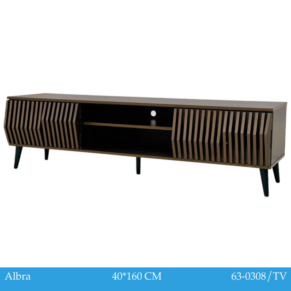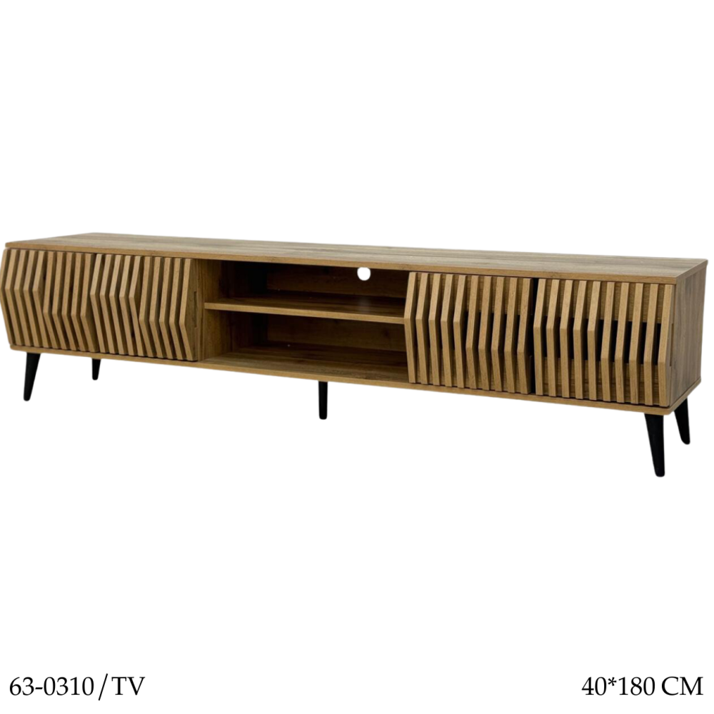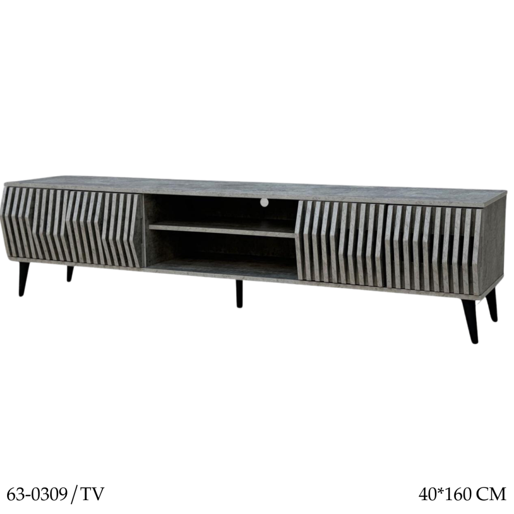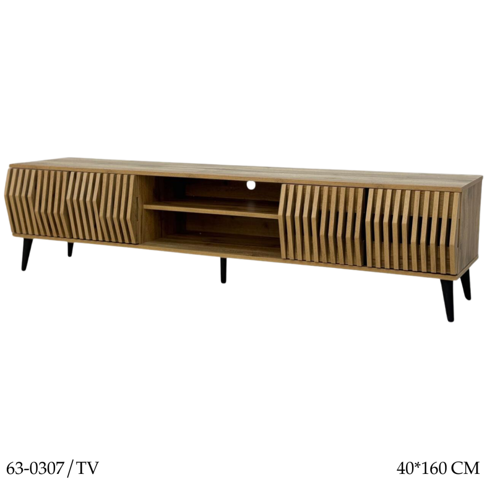 لمحبي التميز في اختيار الديكورات المنزلية نقدم لكم طاولة البلازما هذه المصنوعة من أجود المواد المتينة بتصميم مزين بقضبان جانبية طولية نافرة تضفي لمسة ثلاثية الأبعاد للتصميم، بالإضافة إلى رفين في المنتصف لتطبيق أجهزة الصوت.