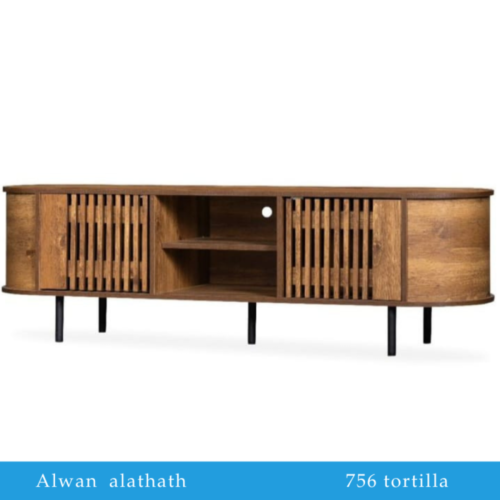 طاولة تلفزيون مميزة بتصميم فخم وعصري مصنوعة من أجود المواد المقاومة للخدش ومزودة بأرجل معدنية مقاومة للكسر، تتميز الطاولة بتصميم ملتف عند الجوانب يضفي لمسة من الانسيابية للتصميم، كما أنها مزودة بعدة رفوف لحفظ أجهزة التحكم والصوت.