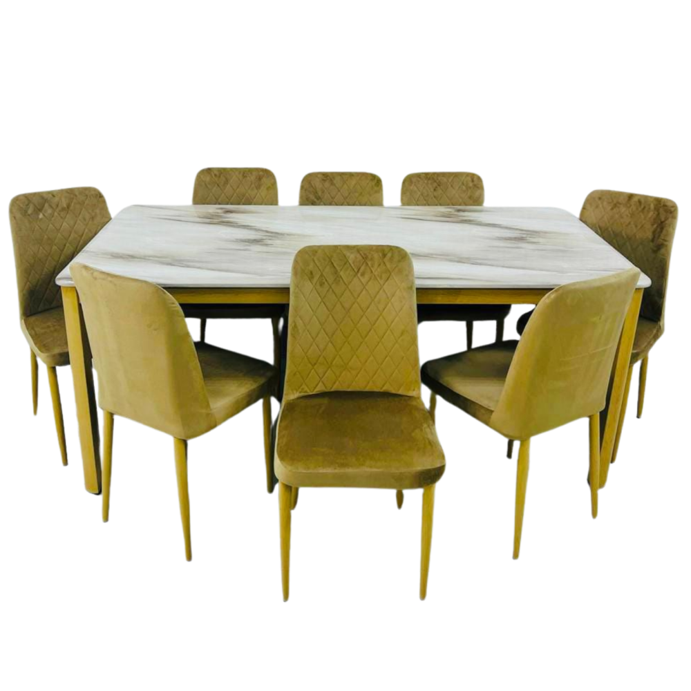 في متجر ستار هومي نوفر لكم طقم طاولة الطعام هذا المؤلف من طاولة مصنوعة من أجود أنواع الرخام الفخم الذي يعكس طابع من الرقي والاناقة على الديكور المحيط، ومزود بمجموعة من الكراسي المزودة بمسند ظهر مزين بدرزات بشكل معينات متجاورة.