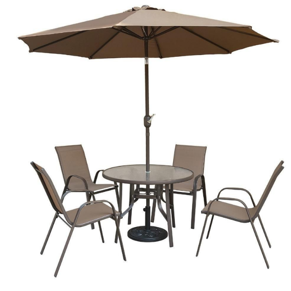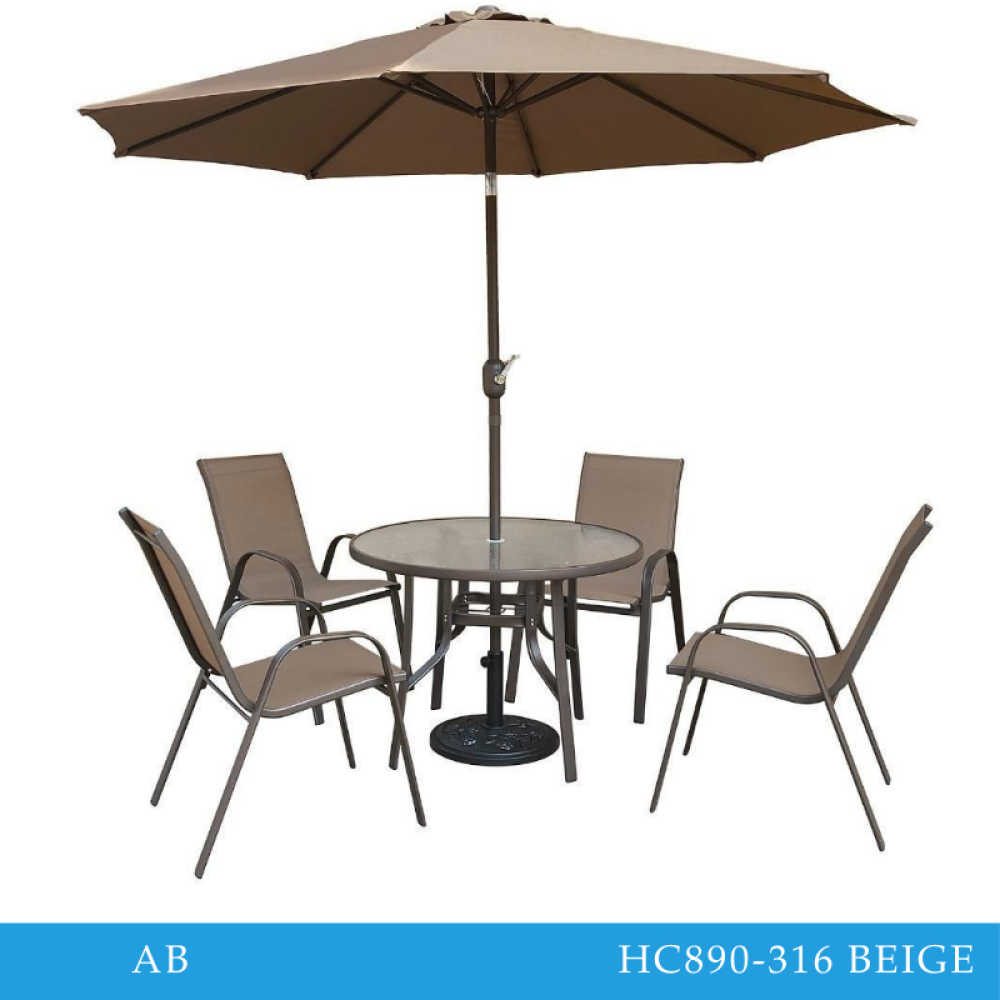 طقم جلسة خارجية مؤلف من طاولة دائرية واربعة كراسي، تتميز الكراسي بتصميم بجم متوسط يوفر الراحة أثناء الجلوس والاستمتاع بالطبيعة، كما تم إضافة مظلة بحجم كبير توفر الحماية من أشعة الشمس أو من الأمطار.