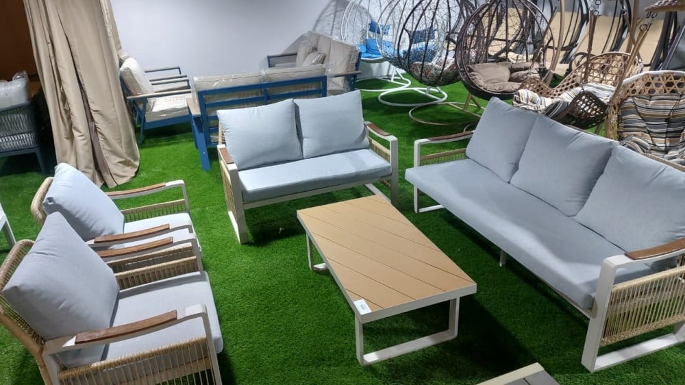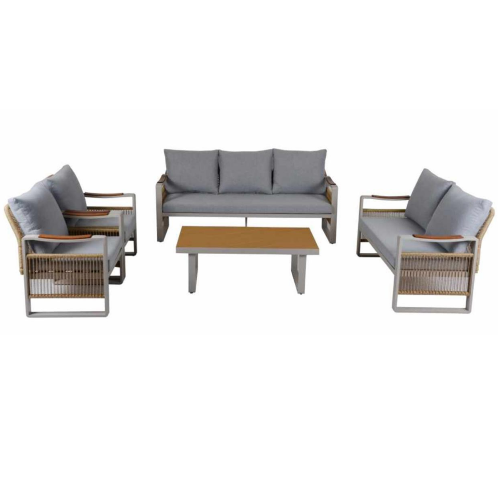 ضمن قسم الجلسات الخارجية في متجر ستار هومي نقدم لكم طقم الجلسة هذا المميز بتصميم فخم وأنيق مناسب لحديقة المنزل أو للمطاعم والمقاهي ذات الطابع الفخم، هذا الطقم مصنوع من اجود المواد المقاومة للاهتراء والعوامل الجوية، مزود بعدد من الكنب والكراسي مزودة بمسند أذرع بشكل قضبان طولية تضفي لمسة من التميز على التصميم، كما يأتي مع طاولة بتصميم مستطيل.