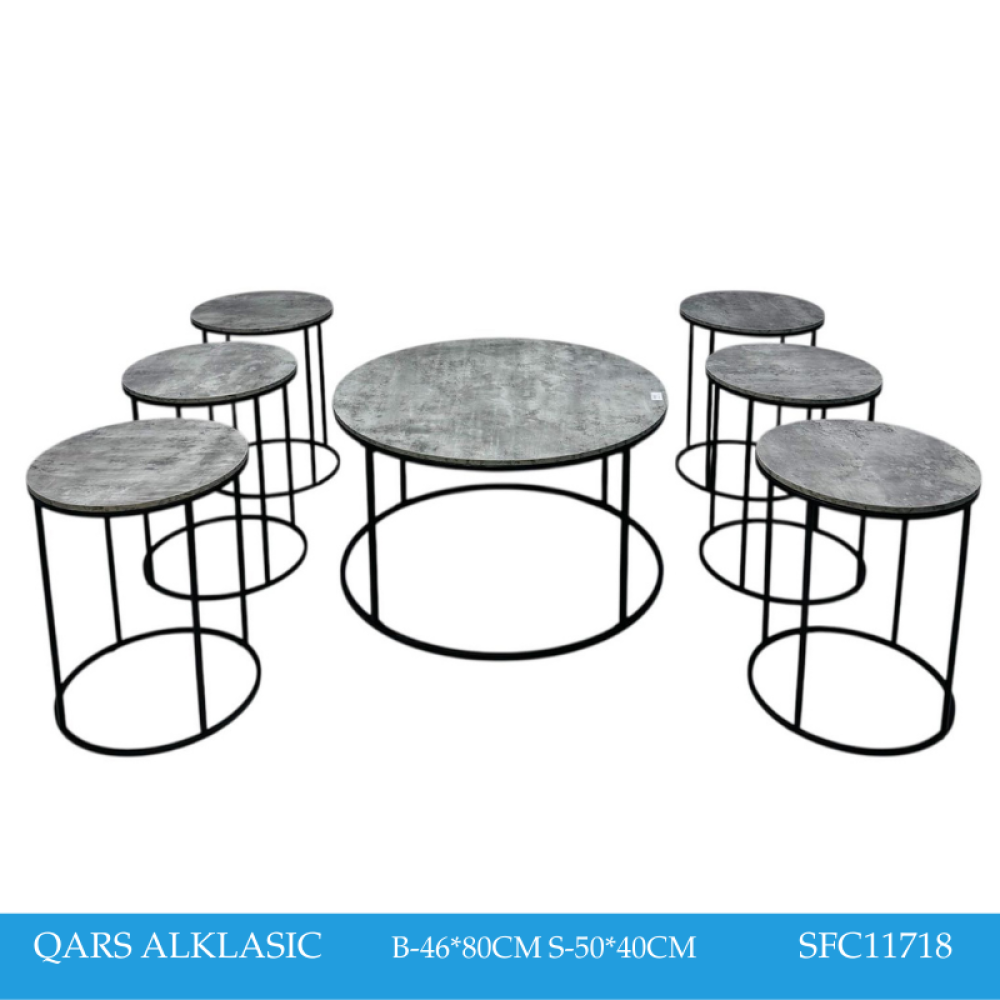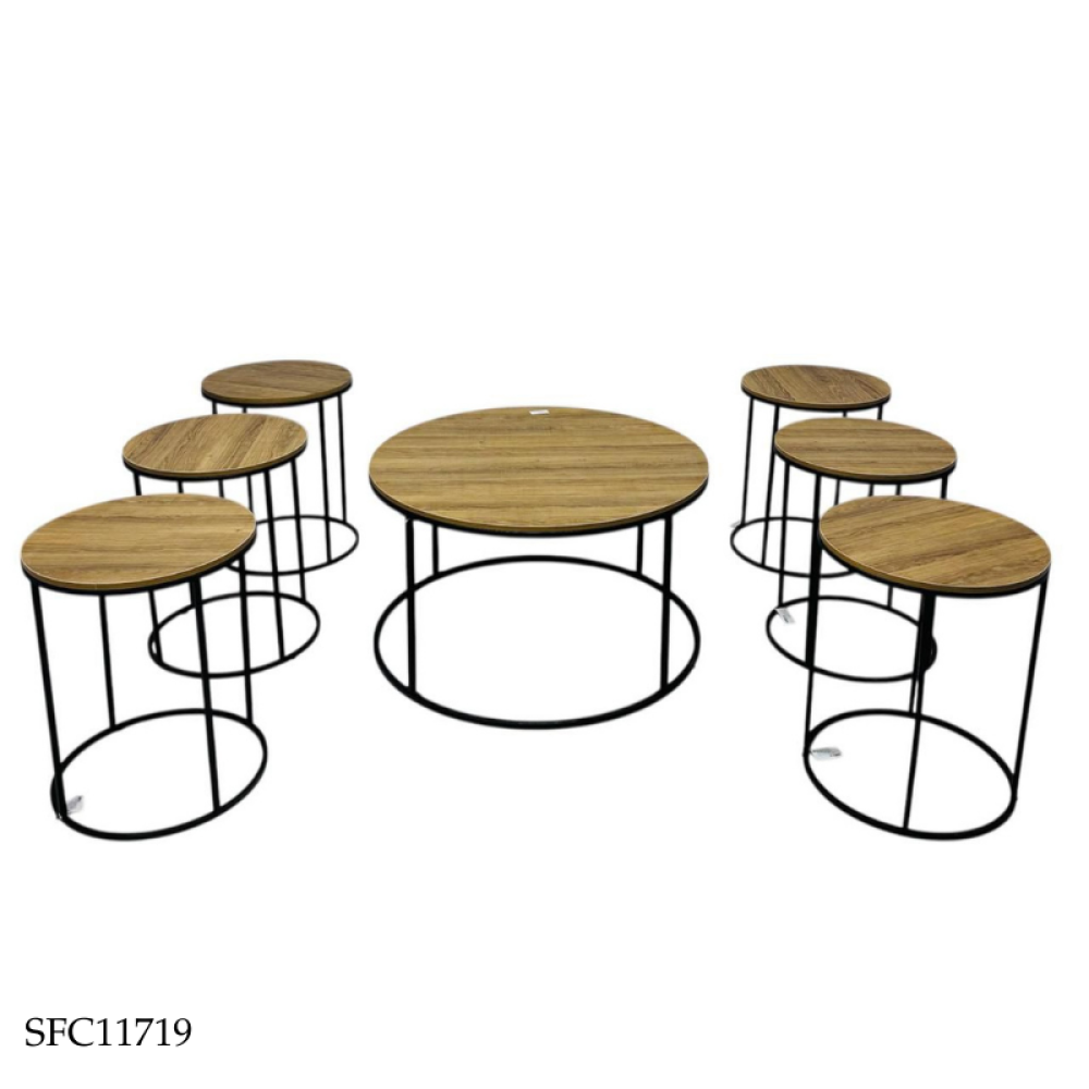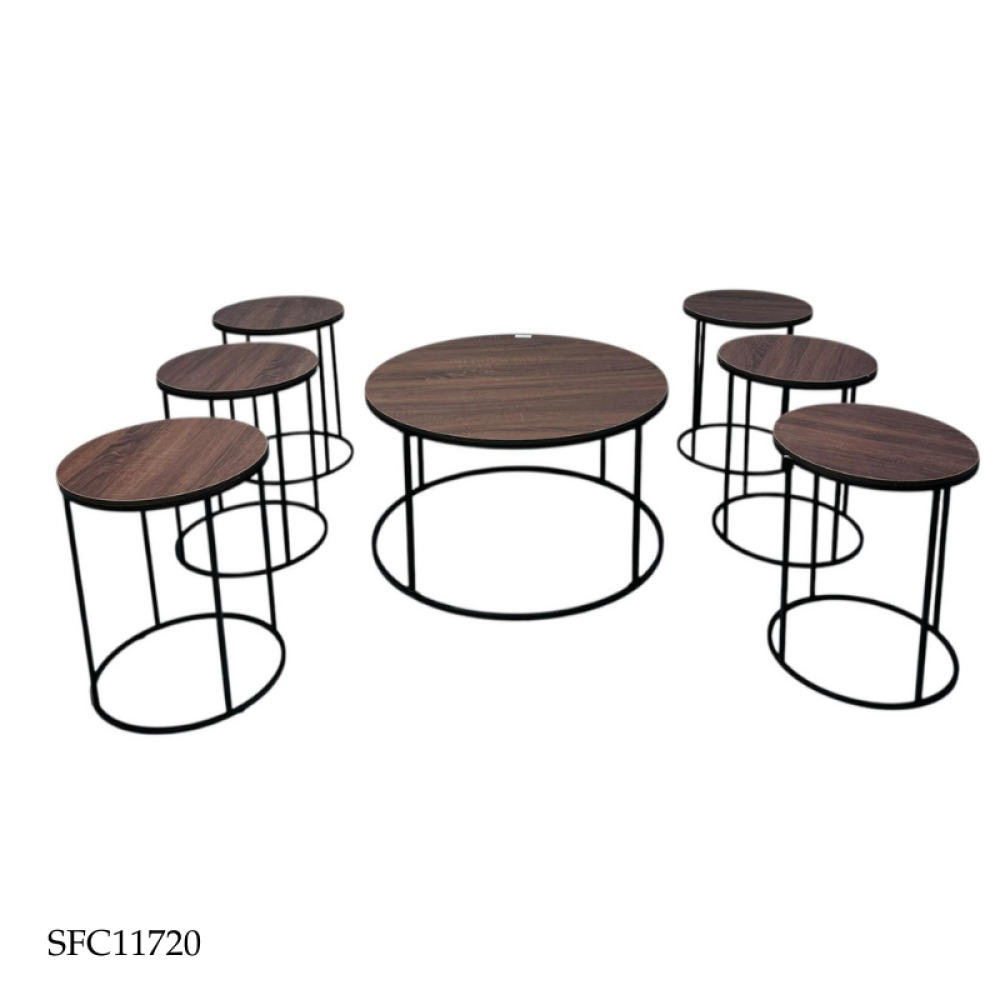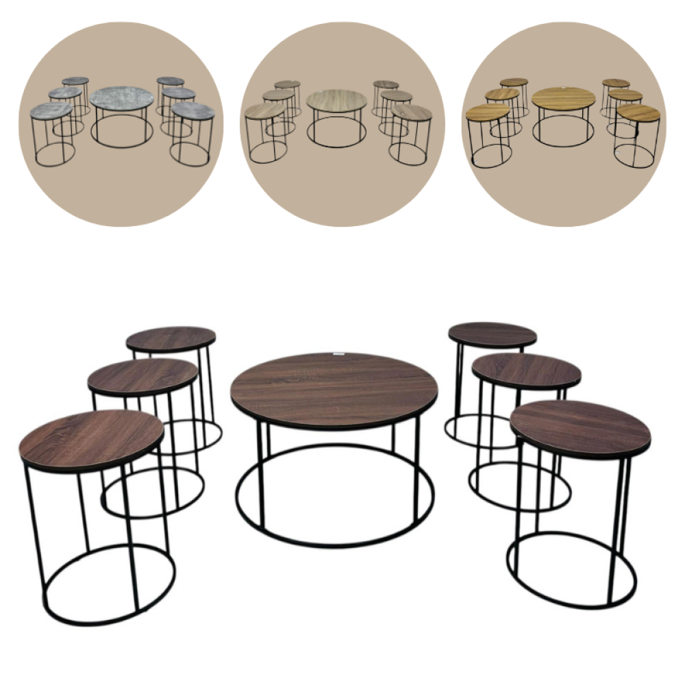 طقم طاولات أنيق وعصري بتصميم دائري وقاعدة معدنية سوداء، يتكوّن من 7 طاولات جانبية وطاولة وسطية، متوفر بعدة ألوان علوية.