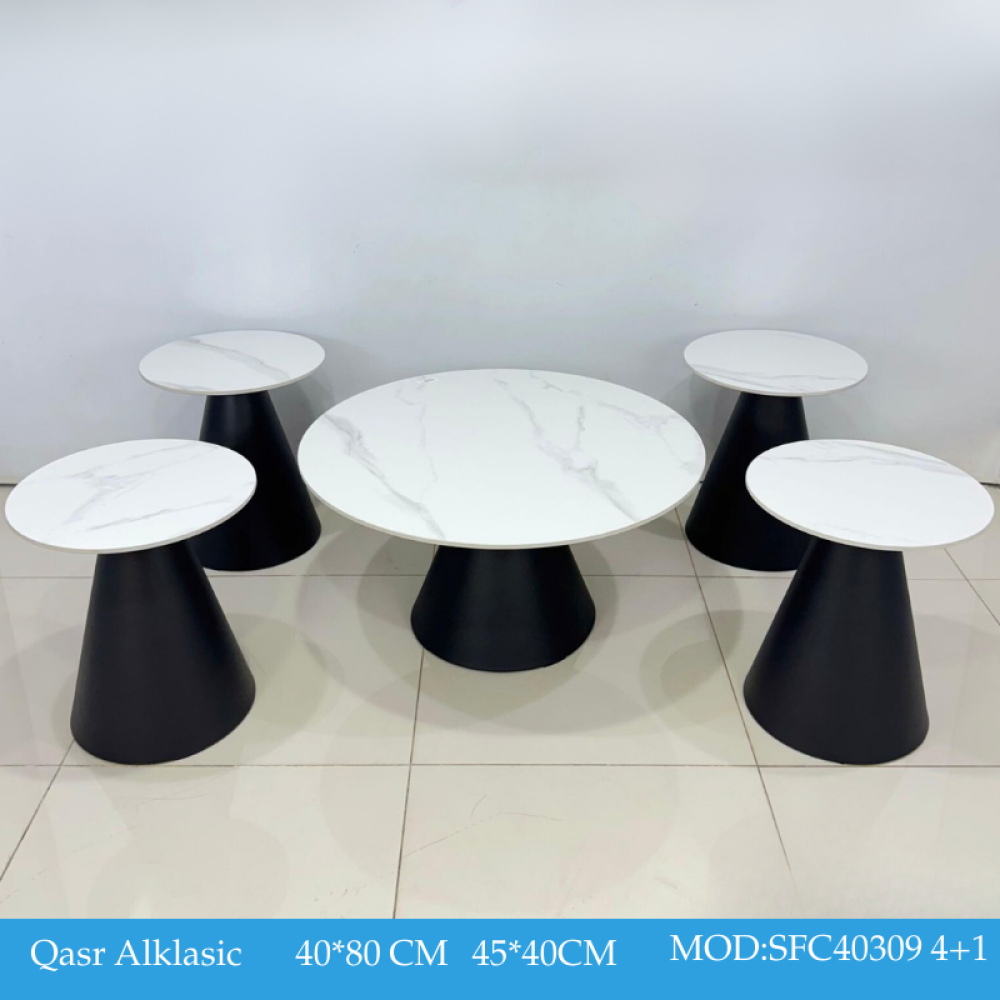 قم بتوفير مساحة خدمة واسعة لأفراد العائلة والضيوف مع طقم طاولات الخدمة هذا المؤلف من طاولة وسط وأربعة طاولات جانبية، الطاولات مزودة بسطح مصقول وناعم بالإضافة لحامل مخروطي متين مطلي باللون الأسود الذي يوفر لمسة من الفخامة.