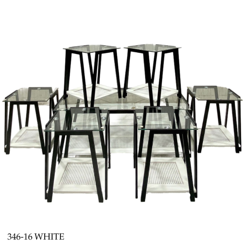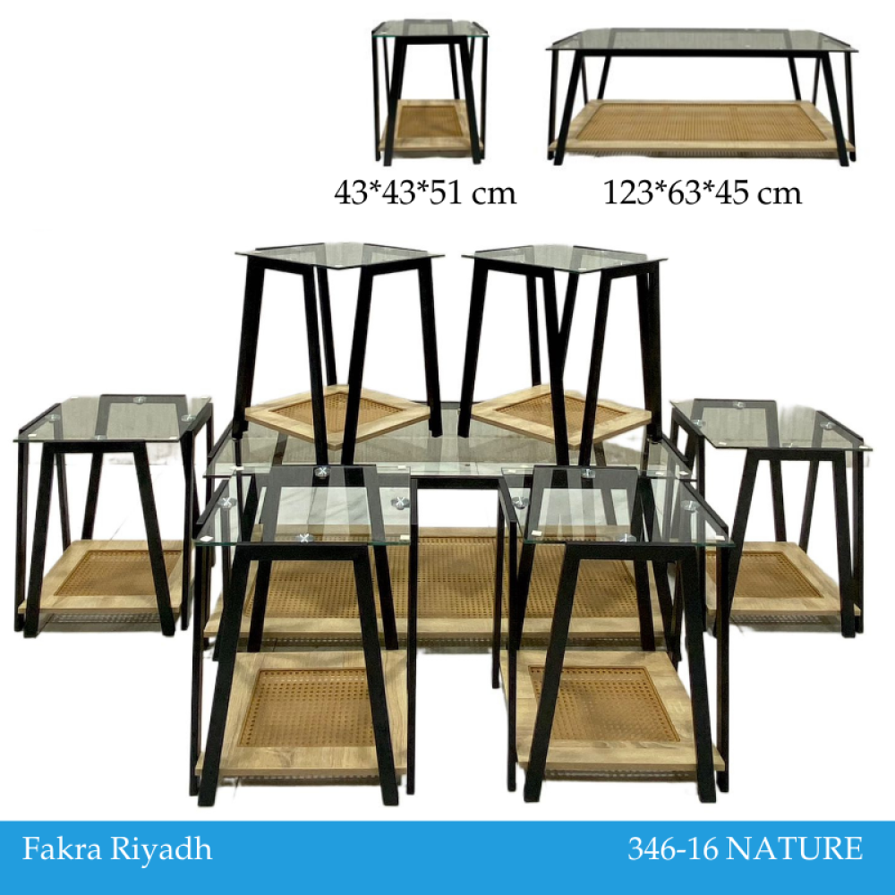 طقم طاولات خدمة مصنوعة من أجود المواد المتينة، مؤلف من طاولة وسط وأربعة طاولات جانبية، الطاولات مزودة بسطح مصنوع من الزجاج الشفاف بالإضافة لرف سفلي مصنوع من الراتان الذي يضفي لمسة من التميز والفخامة لتصميم الطاولات، نوفرها لكم في متجر ستار هومي بعدة ألوان لاختيار المناسب منها للديكور المحيط.