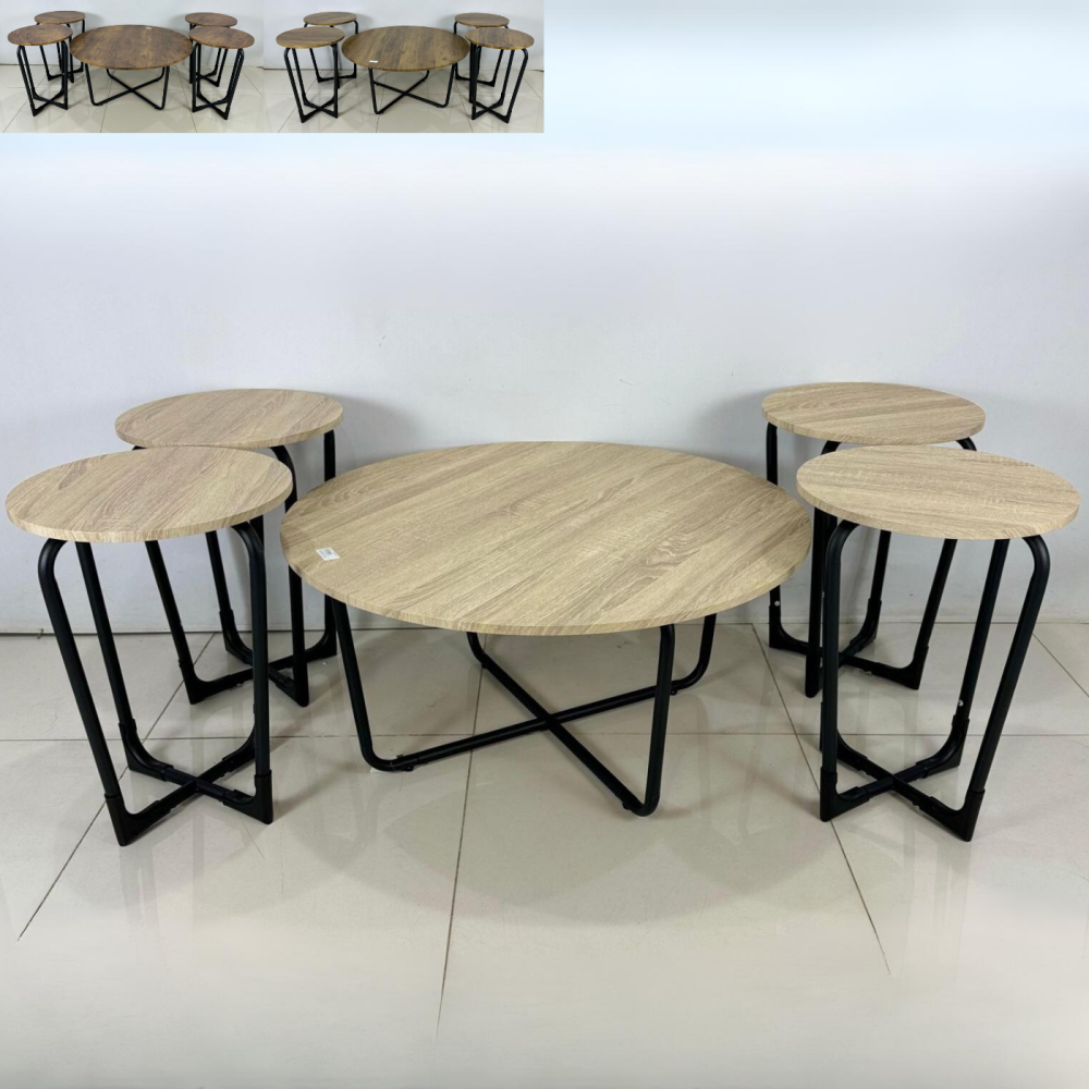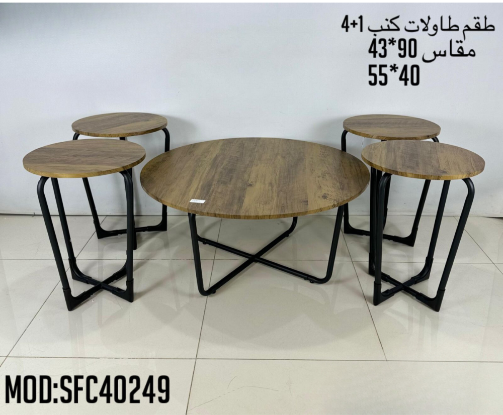 طقم طاولات خدمة مؤلف من طاولة دائرية بحجم كبير وأربعة طاولات صغيرة، الطاولات مصنوعة من أجود المواد، مزودة بقاعدة متينة من الحديد تضيف المزيد من الأناقة على التصميم، مما يجعلها الاختيار الأمثل في غرفة المعيشة.