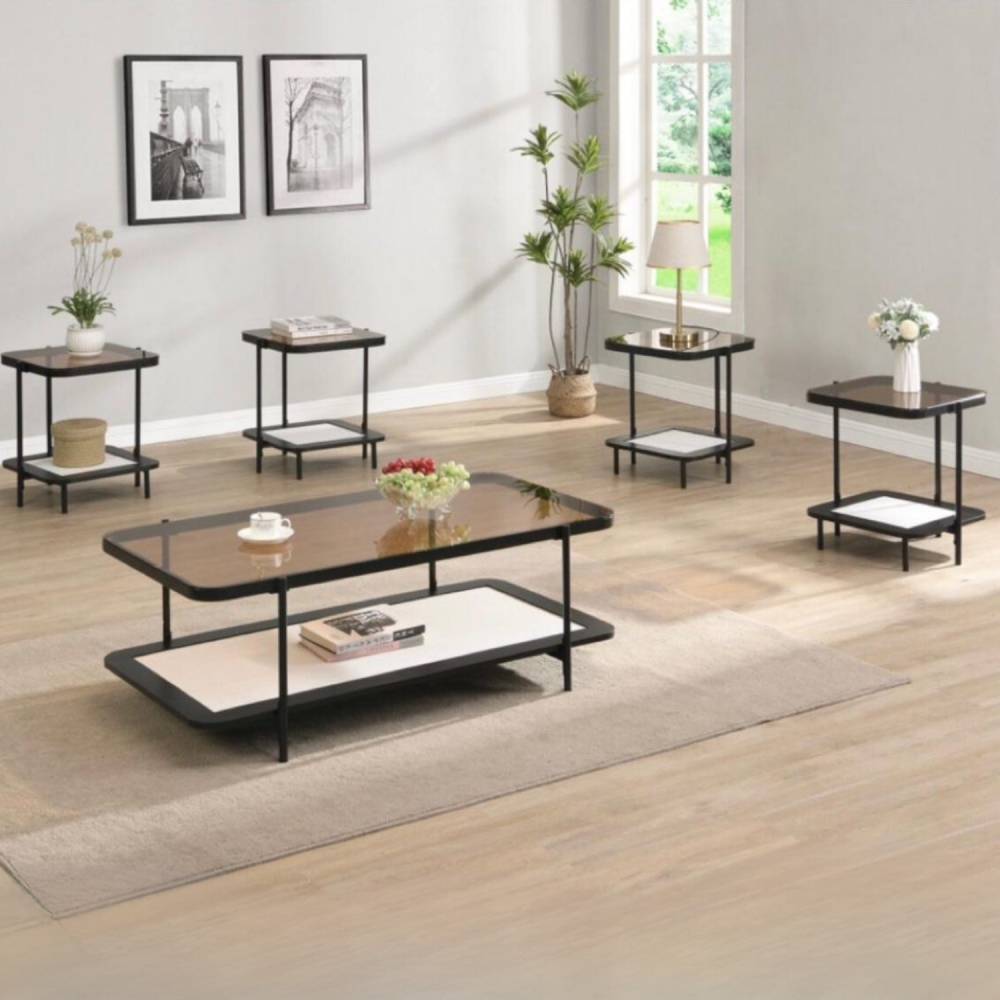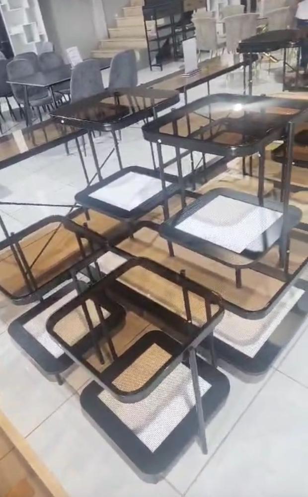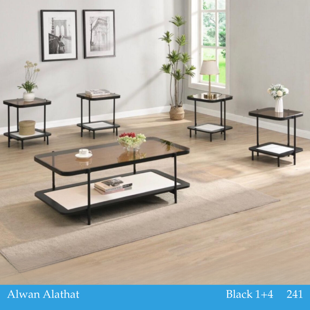 لتحصلي سيدتي على مساحة خدمة واسعة في غرفة المعيشة أو الضيوف نقدم لك طقم طاولات الخدمة هذا المؤلف من طاولة وسط وأربعة طاولات جانبية، مصنوعة من أجود المواد ومزودة بسطح سفلي مصنوع من الراتان الفخم، كما تتميز الطاولات بأرجل معدنية متينة مطلية بالأسود.