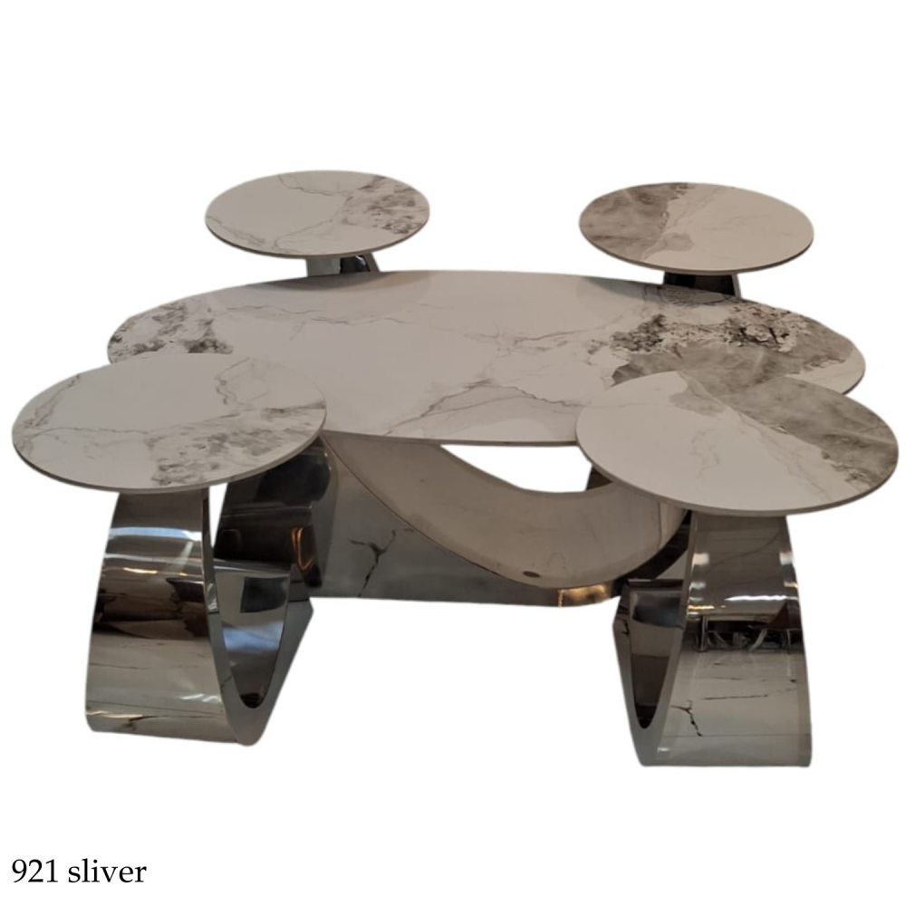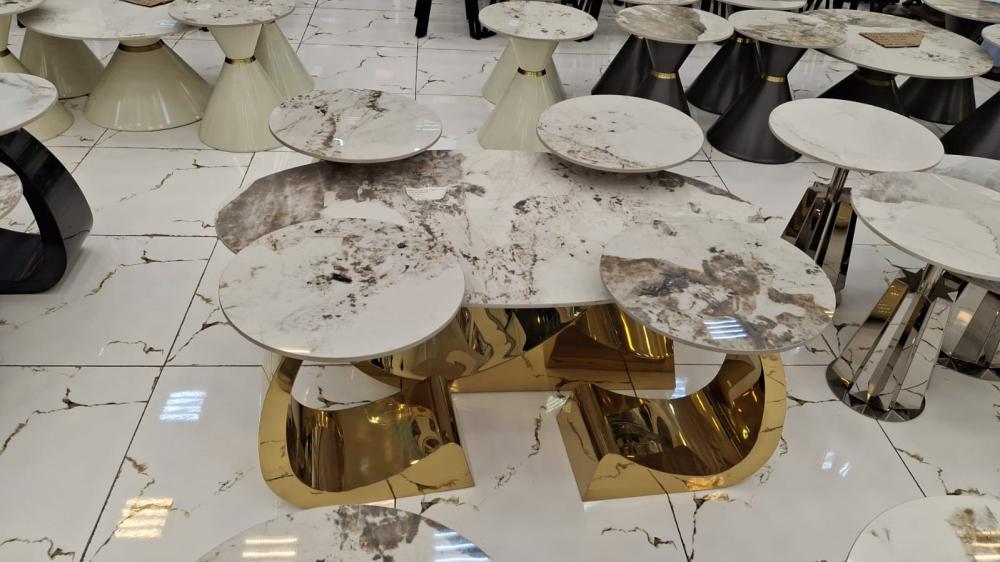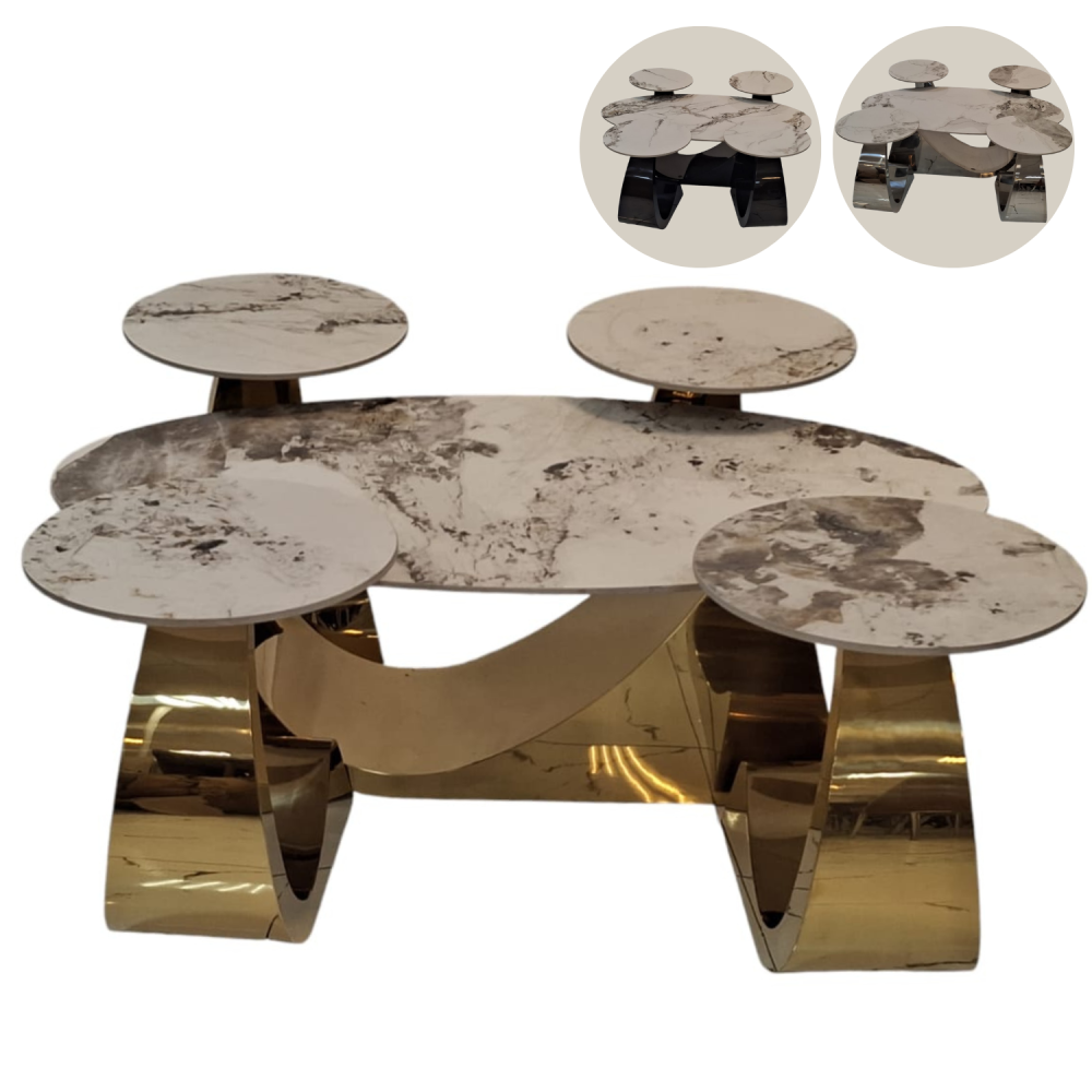 اضيفي سيدتي لمسة من الفخامة والعصرية لديكور غرفة المعيشة أو الضيوف مع طقم طاولات الخدمة هذا المؤلف من طاولة وسط كبيرة وأربعة طاولات جانبية مزودة بسطح مموه بتموجات لونية متناسقة مصنوع من البورسلان، كما تتميز بحامل من الستيل المطلي المصمم بأشكال هندسية تخطف الأنظار.