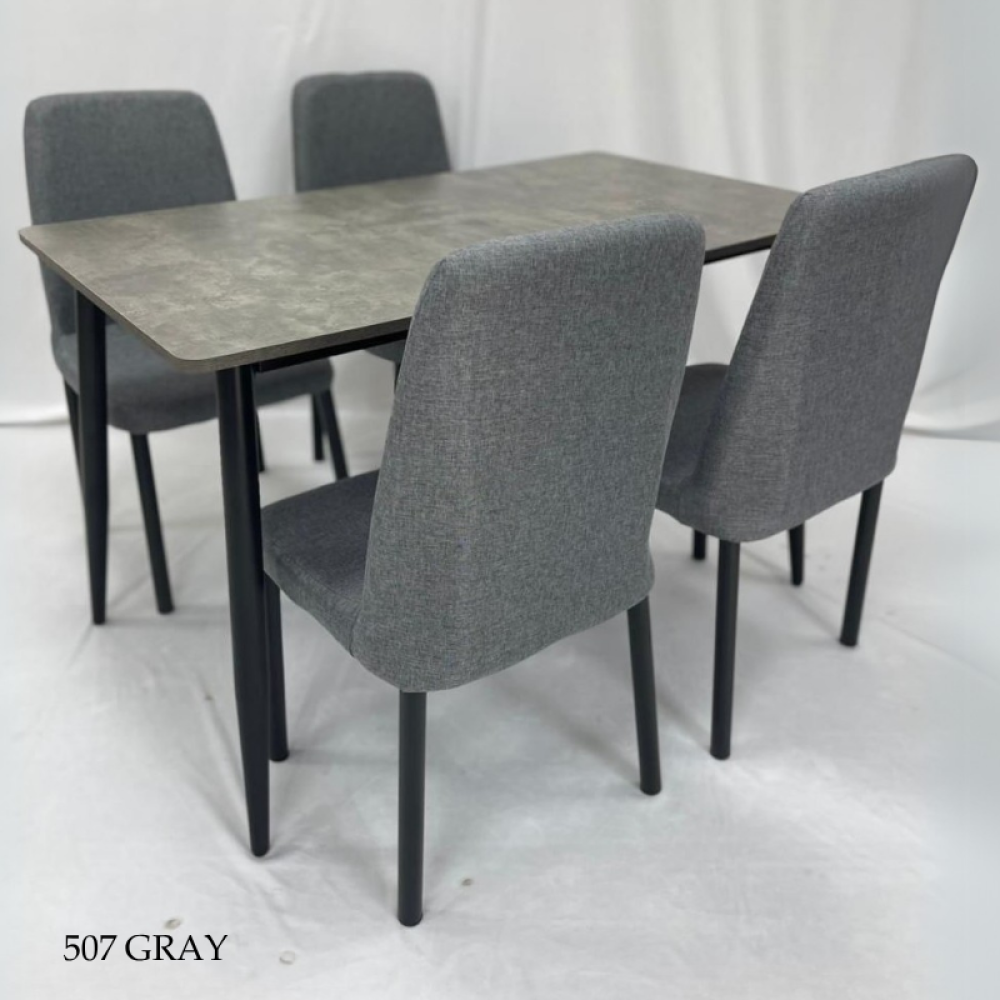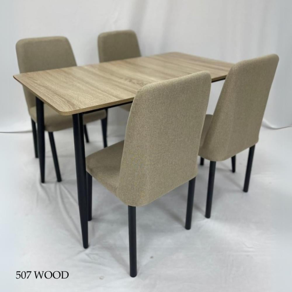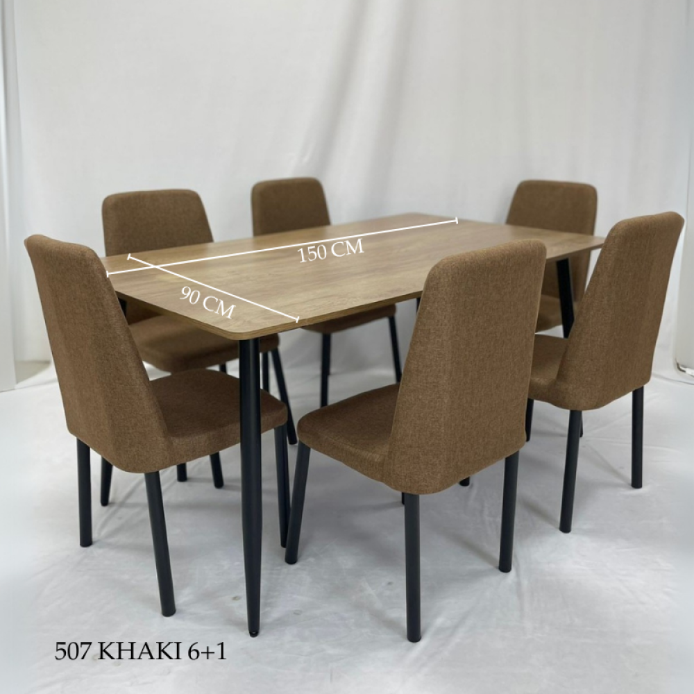 - الخامة: سطح الطاولة من خشب أو MDF متين، مع هيكل معدني، والكراسي مبطنة بغطاء قماشي مبطن وقاعدة معدنية