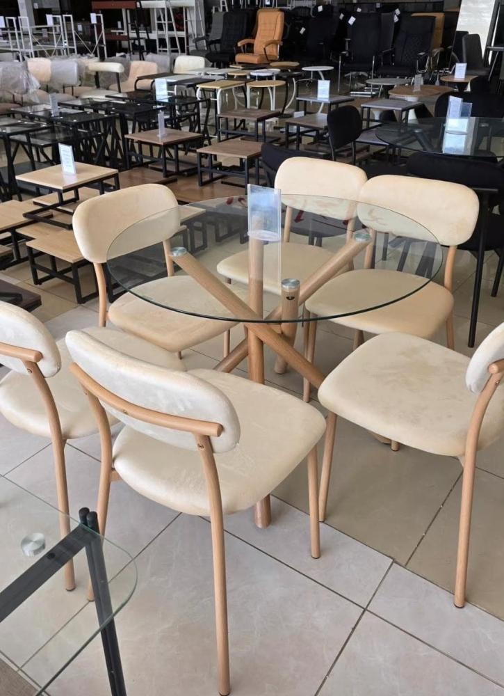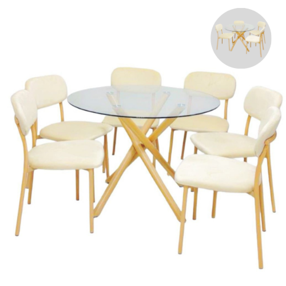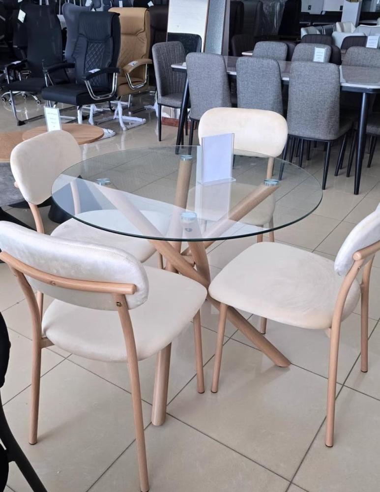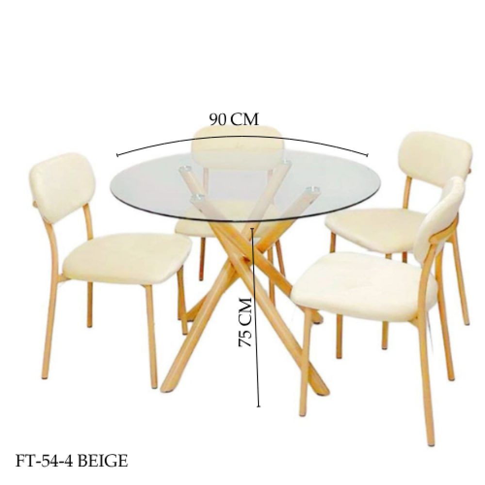 طقم طاولة طعام أنيق بتصميم دائري مودرن، يأتي بسطح زجاجي راقٍ وكراسي بلون بيج مميز تضيف لمسة دفء وأناقة للمكان. مناسب لغرف الطعام العائلية والمجالس بفضل خيارات الحجم وعدد الكراسي، مع خامات عالية الجودة وسهلة