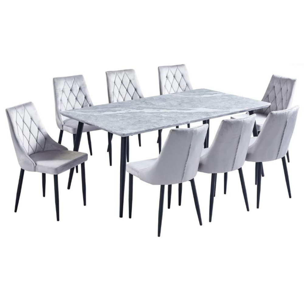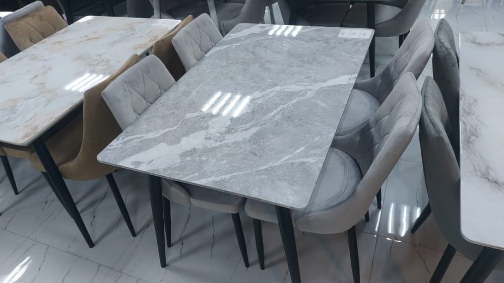 من أجمل تصاميم اطقم طاولات الطعام وأكثرها مواكبة للنمط الحديث في اختيار الديكورات المنزلية هو هذا الطقم الرائع المؤلف من طاولة بتصميم مستطيل بسطح مصقول مقاوم للخدش مزين بتموجات لونية فخمة، وكراسي مصنوعة من أجود الخامات ومزودة بمسند ظهر مزين بدرزات تشكل معينات متجاورة لمزيد من التميز والعصرية في التصميم.