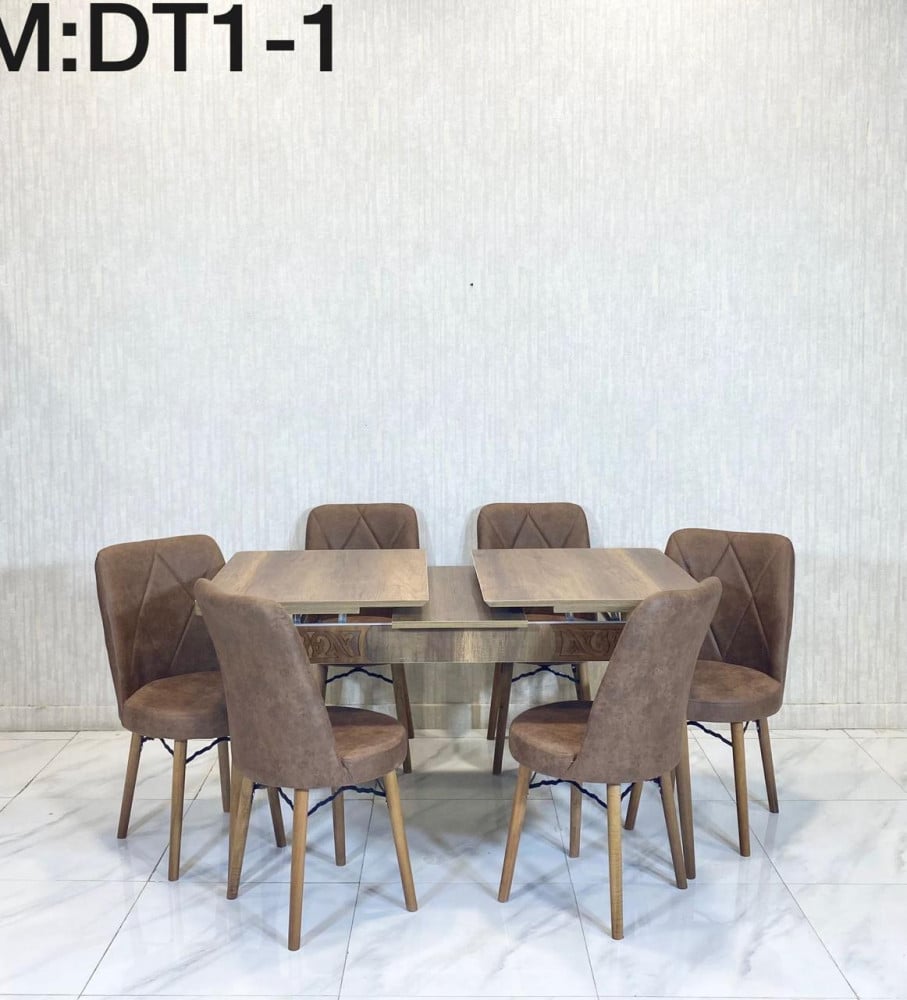 طقم طاولة طعام مصمم لستة انفر مؤلف من طاولة مصنوعة من أجود المواد الفاخرة تتميز بسطح بلون خشبي يضفي لمسة من الفخامة للتصميم، وستة كراسي مصممة بلون يشابه لون الطاولة للحصول على تصميم متناسق للطقم.