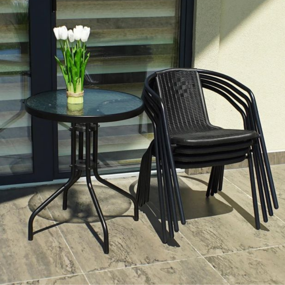 طقم جلسة مؤلفة من طاولة دائرية وكرسيين مصنوعة من مواد متينة ومقاومة للحرارة والأمطار وجميع العوامل الجوية، يمكنك استخدامها في الحديقة الخارجية أو في ركن القهوة في المنزل أو مكتب العمل.