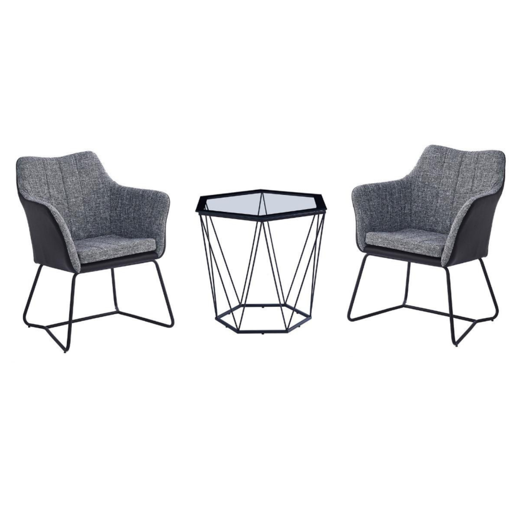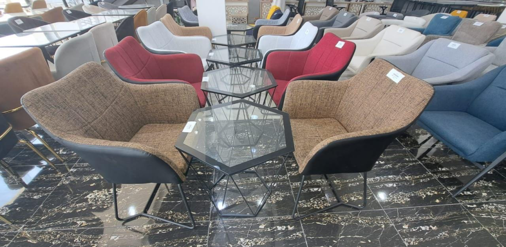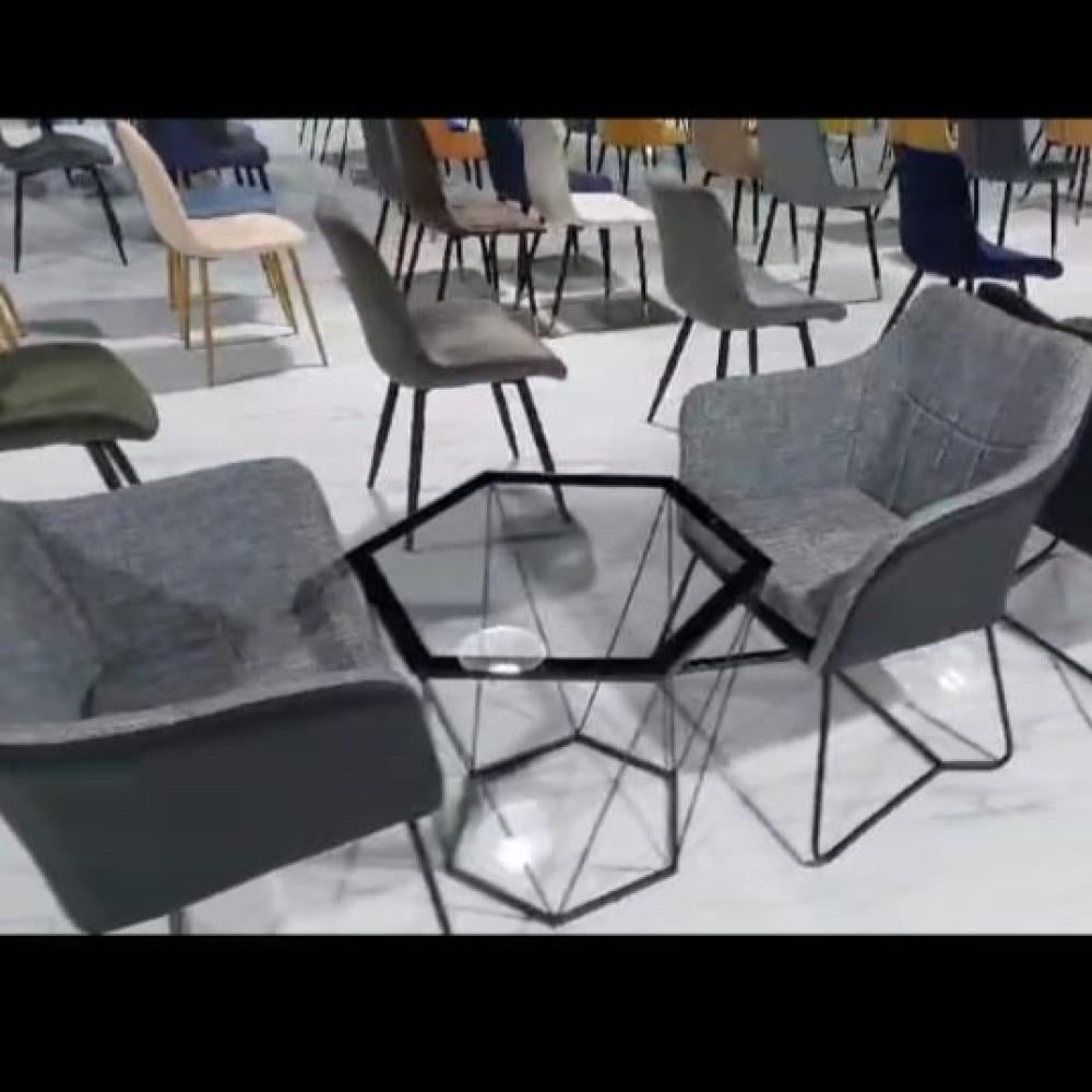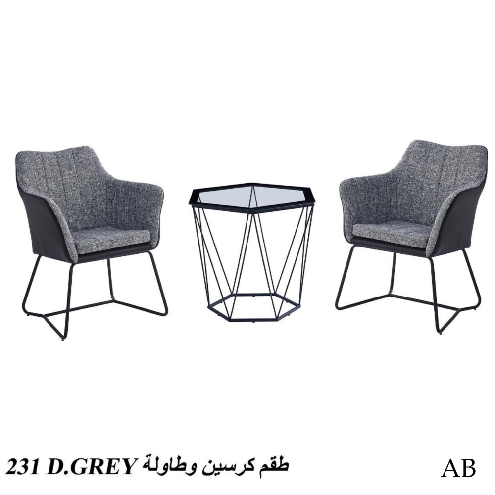 طقم طاولة وكرسيين مناسب لركن القهوة في المنزل ومكتب العمل أو لديكور المقاهي، مؤلف من كرسيين بتصميم مزود بحواف حادة مصنوعان من المخمل الناعم ومزودان بأرجل من قضبان الحديد المتين والمقاوم للصدأ، يتميز تصميم الطاولة بشكل هندسي مسدس في القاعدة والسطح العلوي يرتبطان مع بعضهما بقضبان من الحديد لإضافة لمسة من التميز للتصميم، مزودة بزجاج شفاف علوي لمزيد من التألق والفخامة.