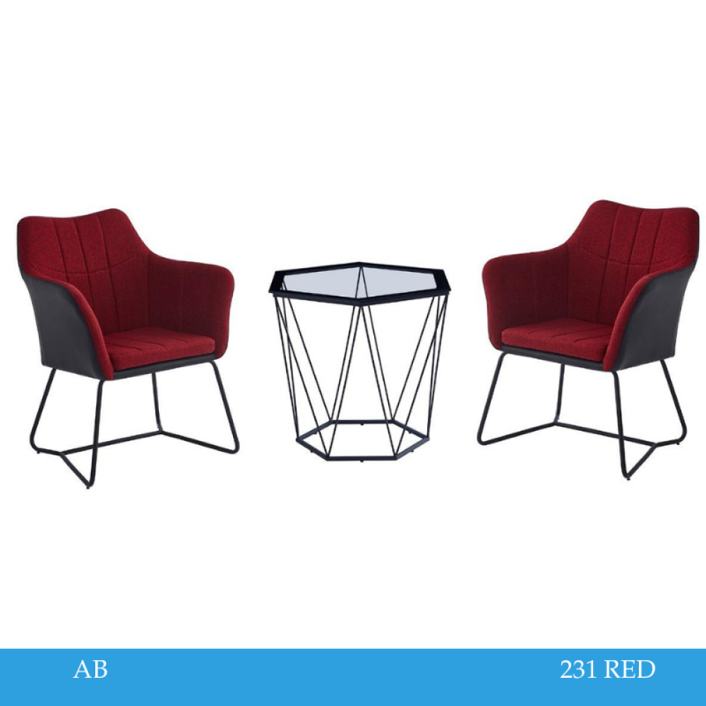 طقم طاولة وكرسيين مناسب لركن القهوة في المنزل ومكتب العمل أو لديكور المقاهي، مؤلف من كرسيين بتصميم مزود بحواف حادة مصنوعان من المخمل الناعم ومزودان بأرجل من قضبان الحديد المتين والمقاوم للصدأ، يتميز تصميم الطاولة بشكل هندسي مسدس في القاعدة والسطح العلوي يرتبطان مع بعضهما بقضبان من الحديد لإضافة لمسة من التميز للتصميم، مزودة بزجاج شفاف علوي لمزيد من التألق والفخامة.