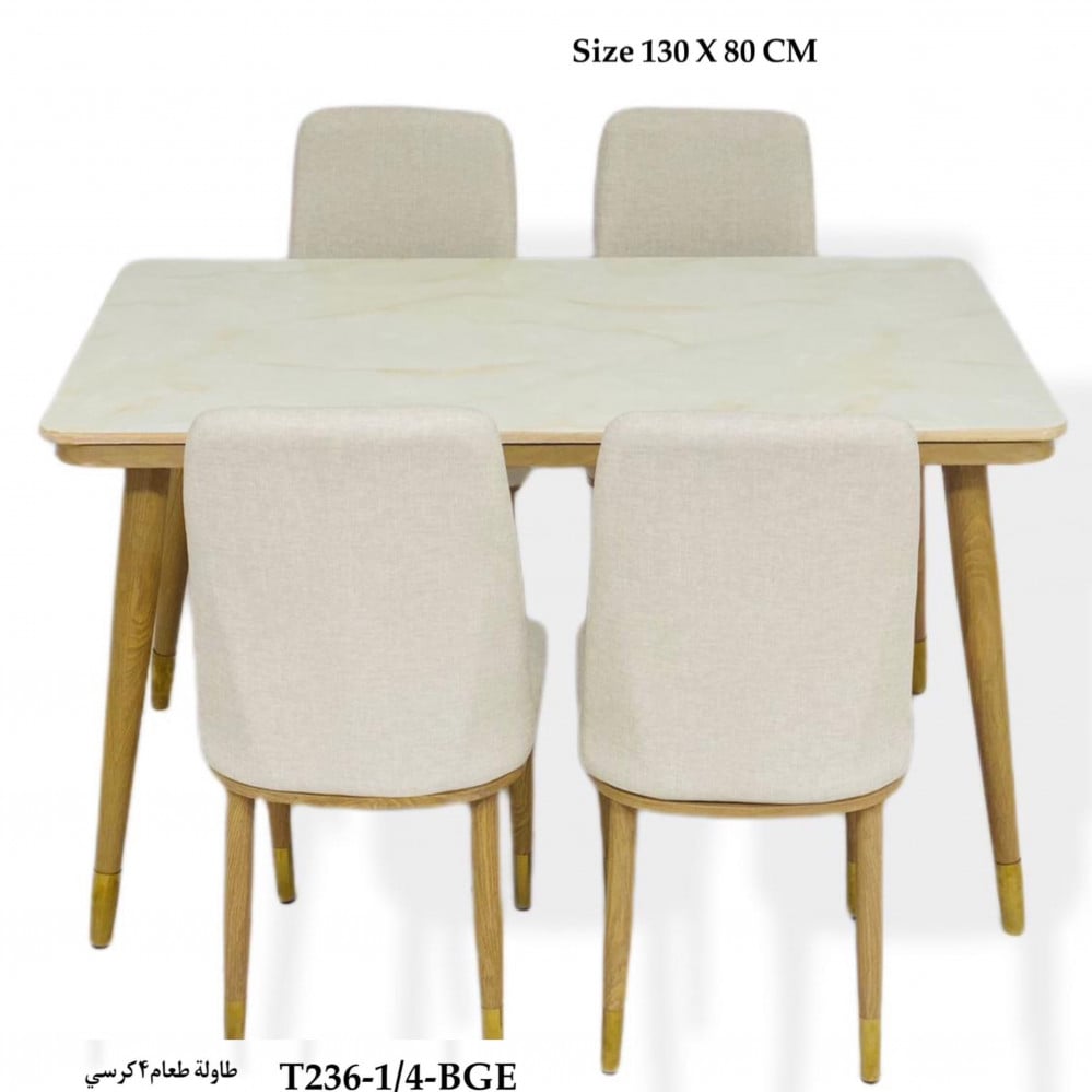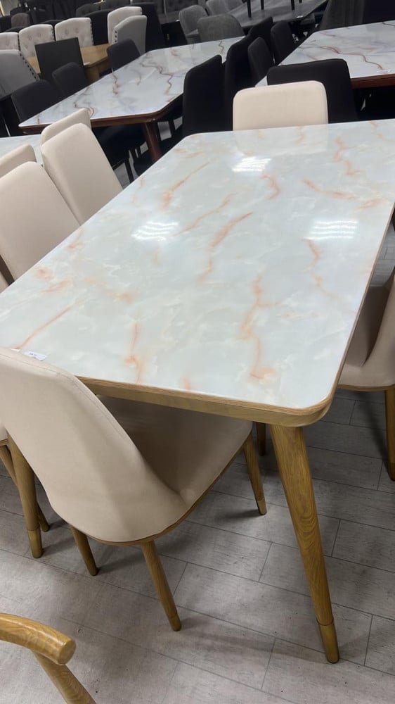 الفخامة في التصميم والجودة في اختيار المواد تجدونها في طقم طاولة الطعام هذا المؤلف ن طاولة مصنوعة من الرخام الطبيعي بسطح أملس مميز بتموجات لونية، ومجموعة من كراسي الطعام المصنوعة من أجود الخامات المبطنة بطبقة من الإسفنج الطري لتوفير الراحة أثناء الجلوس.