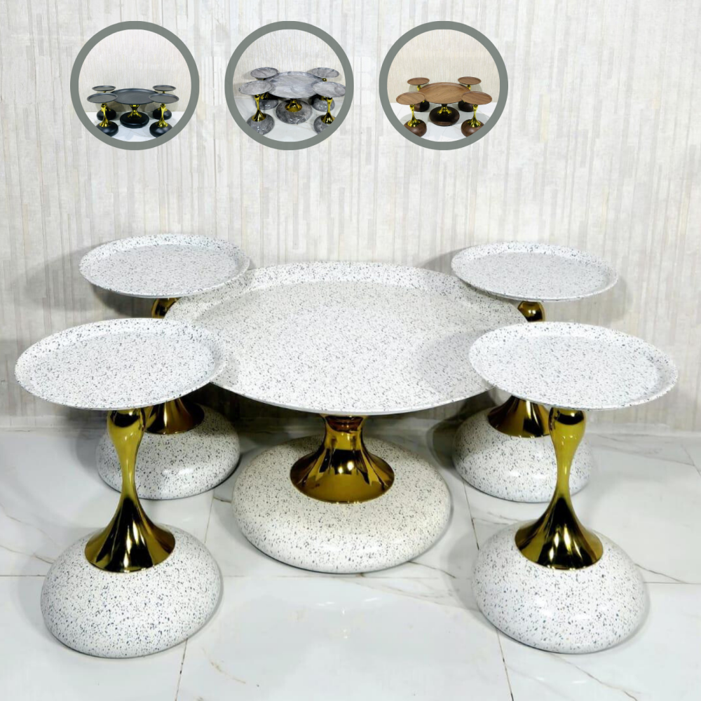 نقدم لكم في متجر ستار هومي طقم الطاولات هذا الرائع والمميز بتصميم فريد يضفي لمسة من الفخامة للديكور وذلك كون الطاولات مزودة بحامل مصنوع من الستانلس ستيل بلون ذهبي، هذه الطقم مؤلف من خمسة طاولات طاولة قهوة كبيرة وأربعة طاولات صغيرة.