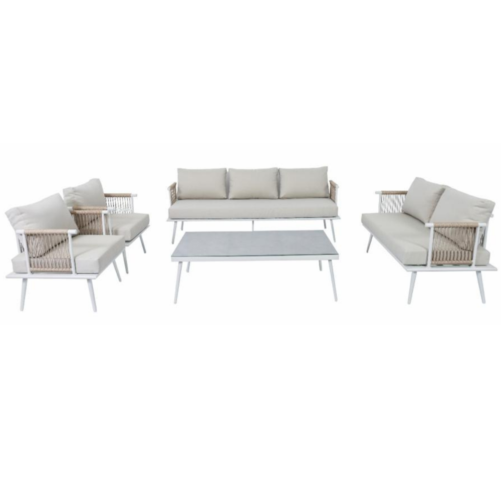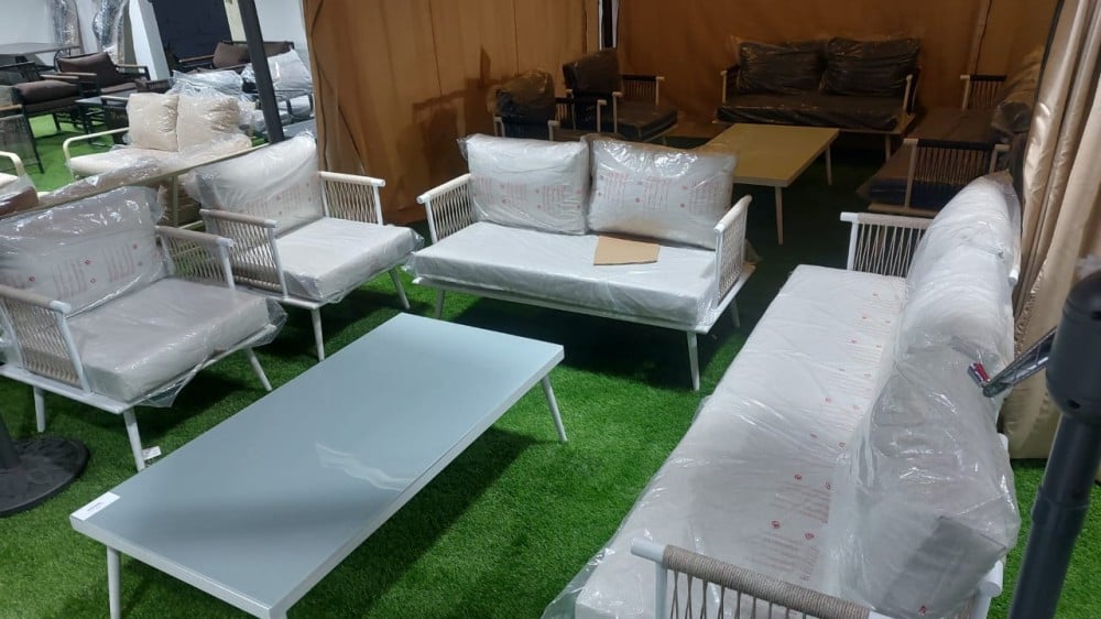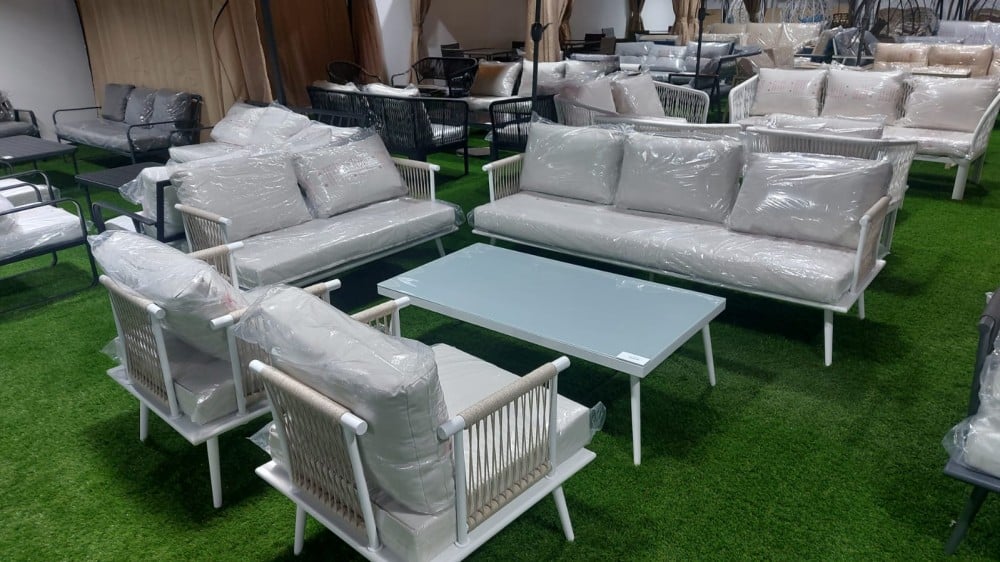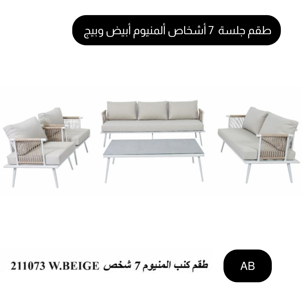 ضمن قسم الجلسات الخارجية في متجر ستار هومي نقدم لكم طقم الجلسة هذا المميز بتصميم فخم وأنيق مناسب لحديقة المنزل أو للمطاعم والمقاهي ذات الطابع الفخم، هذا الطقم مصنوع من الألمنيوم المتين والمقاوم للاهتراء والعوامل الجوية، مزود بعدد من الكنب والكراسي مزودة بمسند أذرع بشكل قضبان طولية تضفي لمسة من التميز على التصميم، كما يأتي مع طاولة بتصميم مستطيل.