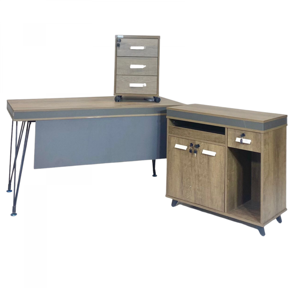 نقدم لكم في متجر ستار هومي تشكيلة واسعة من مكاتب العمل بتصاميم فخمة وعصرية وعملية، ومنها طقم مكتب العمل هذا المؤلف من طاولة عمل وسكرتاريا جانبية يمكنك استخدامها لوضع جهاز الكومبيوتر بالإضافة لخزانة أدراج مؤلفة من ثلاثة أدراج مزودة بدواليب سفلية لسهولة نقل وتحريك والخزانة.