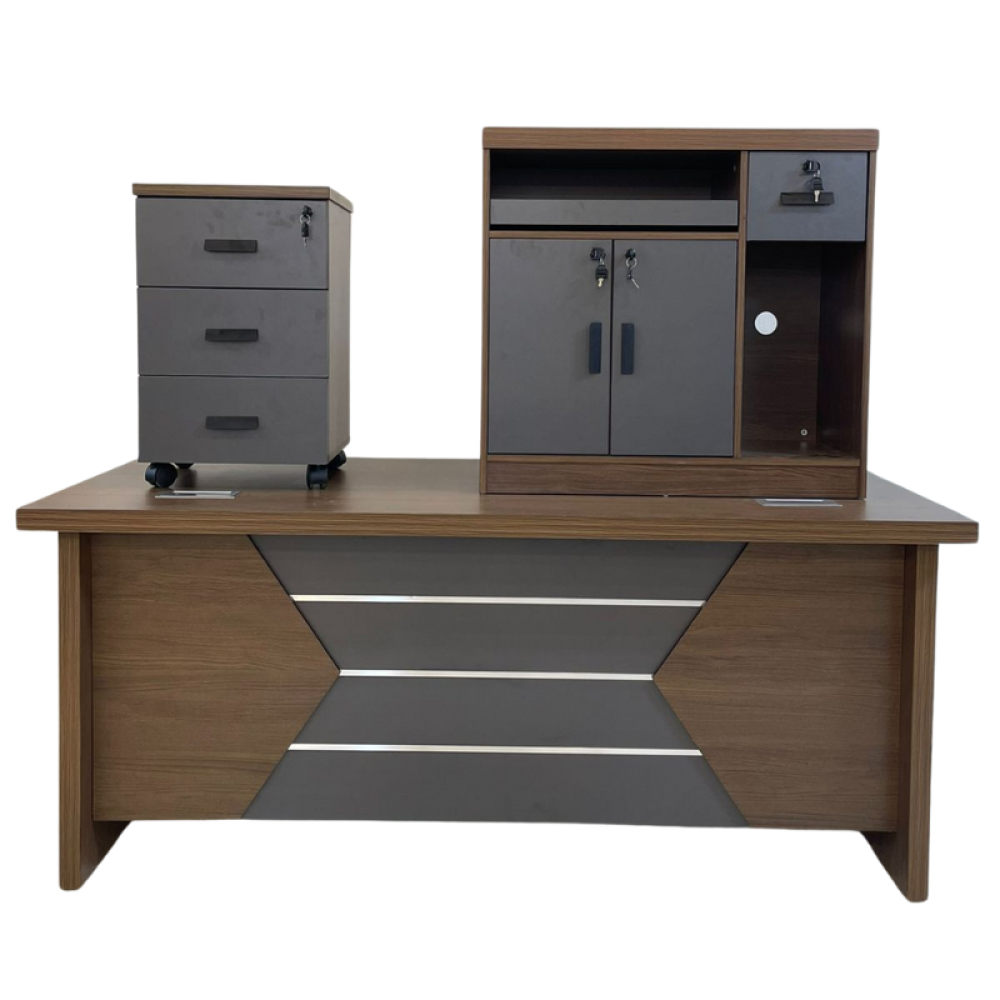 تتمثل الاناقة والفخامة في طقم المكتب هذا، المصنوع من اجود المواد المقاومة للاهتراء والتلف، والمزين بخطوط عرضية في الجهة الامامية تضفي لمسة من التميز للتصميم، هذا المكتب مزود بسكرتاريا ودولاب ادراج لتوفير مساحة واسعة لحفظ أوراق ومستندات العمل.