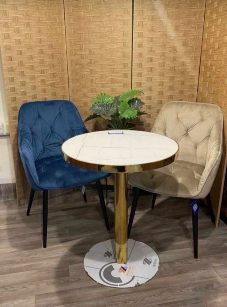 لا تتردد في طلب طقم كراسي الجلوس هذا المصنوع من أجود الأقمشة الناعمة والفخمه والمميز بتصميم مبطن بالإسفنج الطري ومزين بدرزات في نقاط على مسند الظهر والمقعد لتوفير اتصال القماش بالإسفنج الداخلي، الكراسي مزودة بارجل من الحديد المتين بلون أسود فخم.
