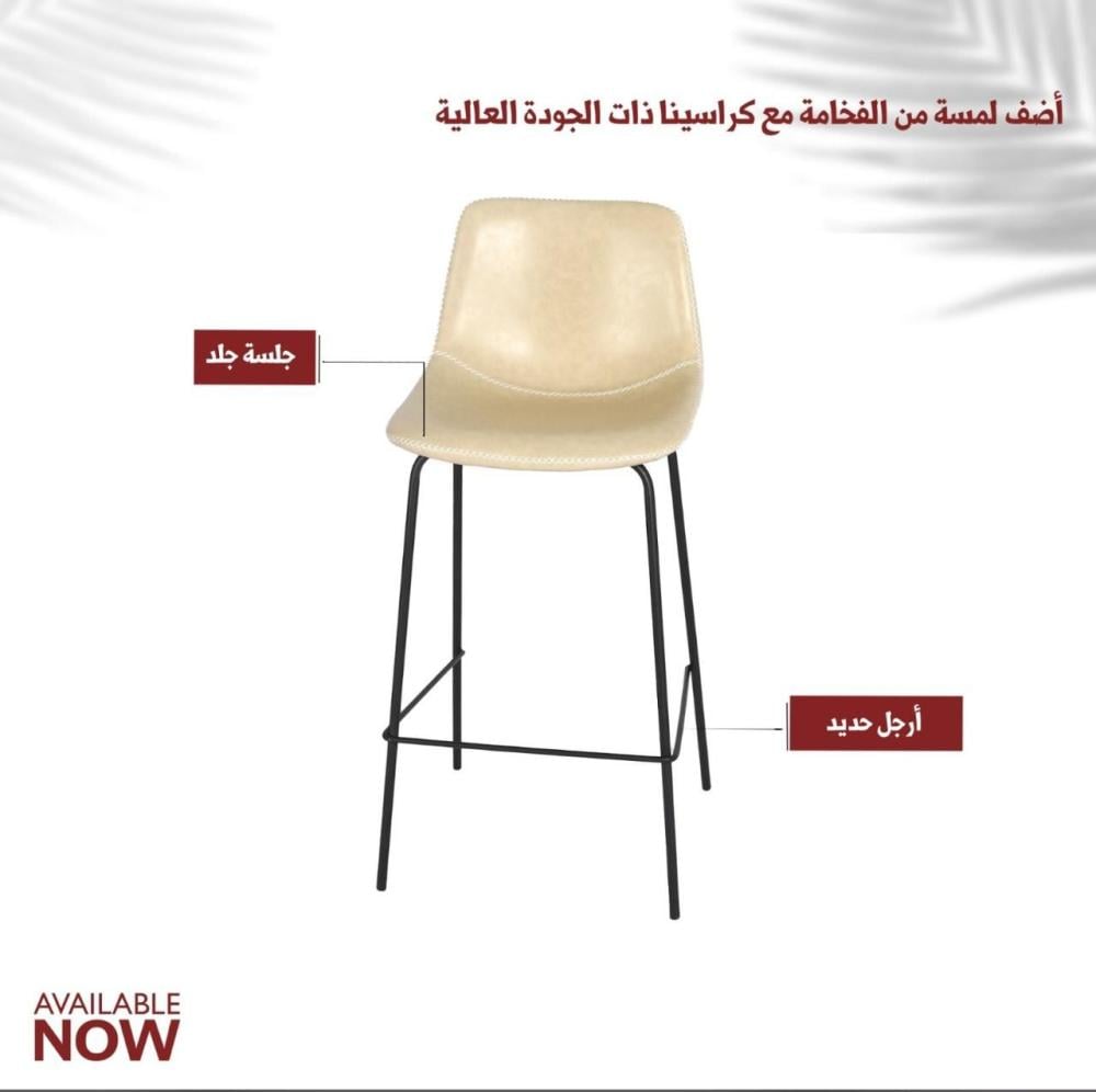 طقم كراسي بار مؤلف من أربعة كراسي مصنوعة من الجلد الطبيعي الفاخر ومزودة بمقعد ومسند ظهر مقعران لتوفير أعلى مستوى من الراحة أثناء الجلوس، بالإضافة إلى أرجل من الحديد المتين مزودة في الأسفل بمسند للأقدام، هذه الكراسي يمكن استخدامها في المطبخ أو ضمن ديكور المطاعم والمقاهي.