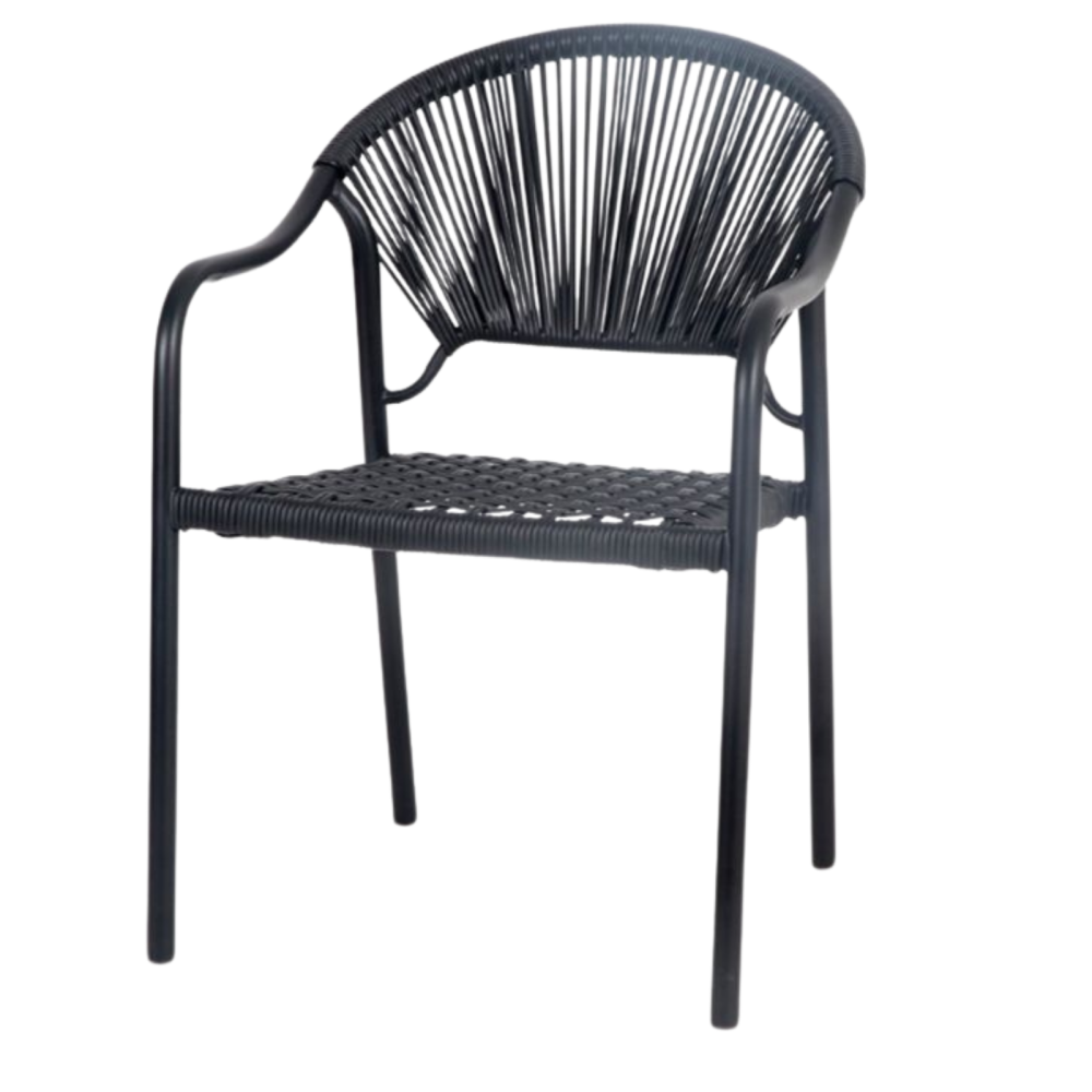 نقدم لكم في متجر ستار هومي طقم كراسي الجلوس هذا المصممة بلون اسود فخم وراقي تتميز بتناسقها مع جميع ألوان المحيط، مصنوعة من مواد مقاومة للحرارة والأمطار وبالتالي فهي مناسبة للجلسات الخارجية في الحديقة والداخلية في المنزل أو مكتب العمل، هذه الكراسي مزودة بمقعد مصنوع من حبال متداخلة بشكل معينات.