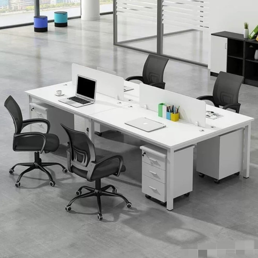 ضمن قسم الأثاث المكتبي في متجر ستار هومي نقدم لكم طقم مكتب العمل هذا المصنوع من مواد متينة ومقاومة للاهتراء ومصمم لأربعة موظفين، الطاولة مزودة بحواجز فاصلة توفر بعض الخصوصية أثناء انجار الأعمال، كما يتميز التصميم بخزانة ادراج جانبية مخصصة لكل موظف تخلق مساحة منظمة أكثر لتخزين الأوراق والمستندات