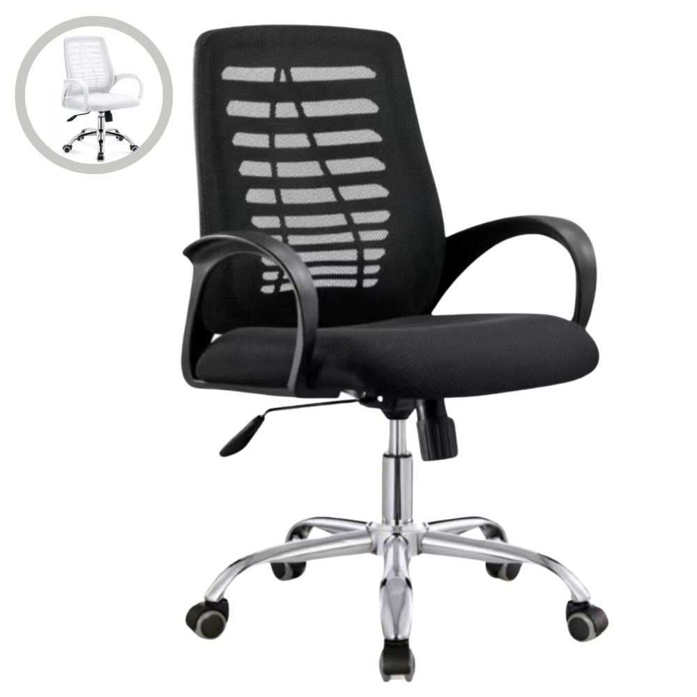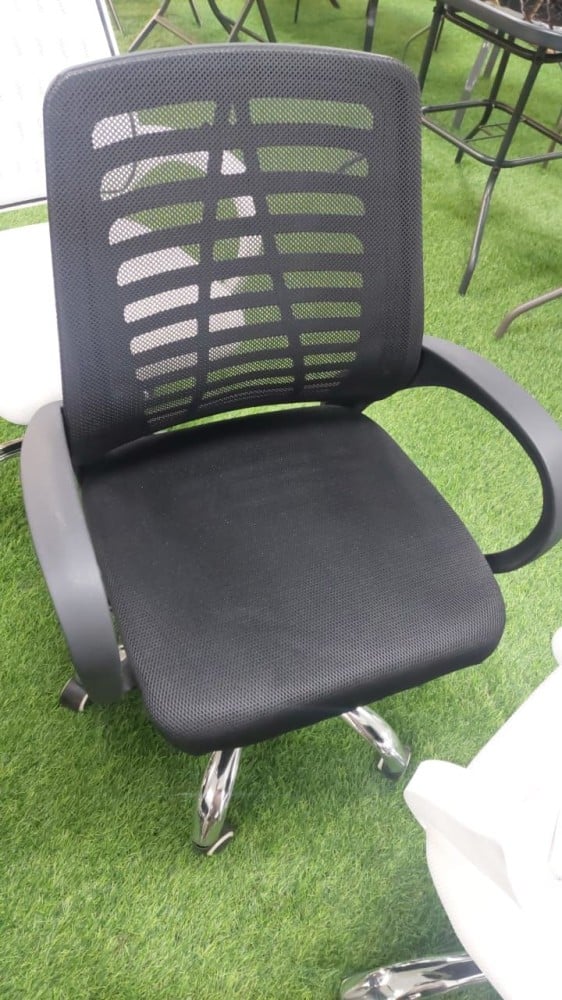 طقم كراسي مكتب مصنوعة من أجود المواد المتينة ومزودة بحامل معدني متين، كما تتميز بتصميم انسيابي يوفر الراحة أثناء الجلوس وتنفيذ الأعمال المكتبية، هذه الكراسي مزودة بمسند ظهر بثقوب صغيرة توفر نفوذية للهواء، كما أنها مزودة بمكانزم تعديل الارتفاع وميول مسند الظهر.