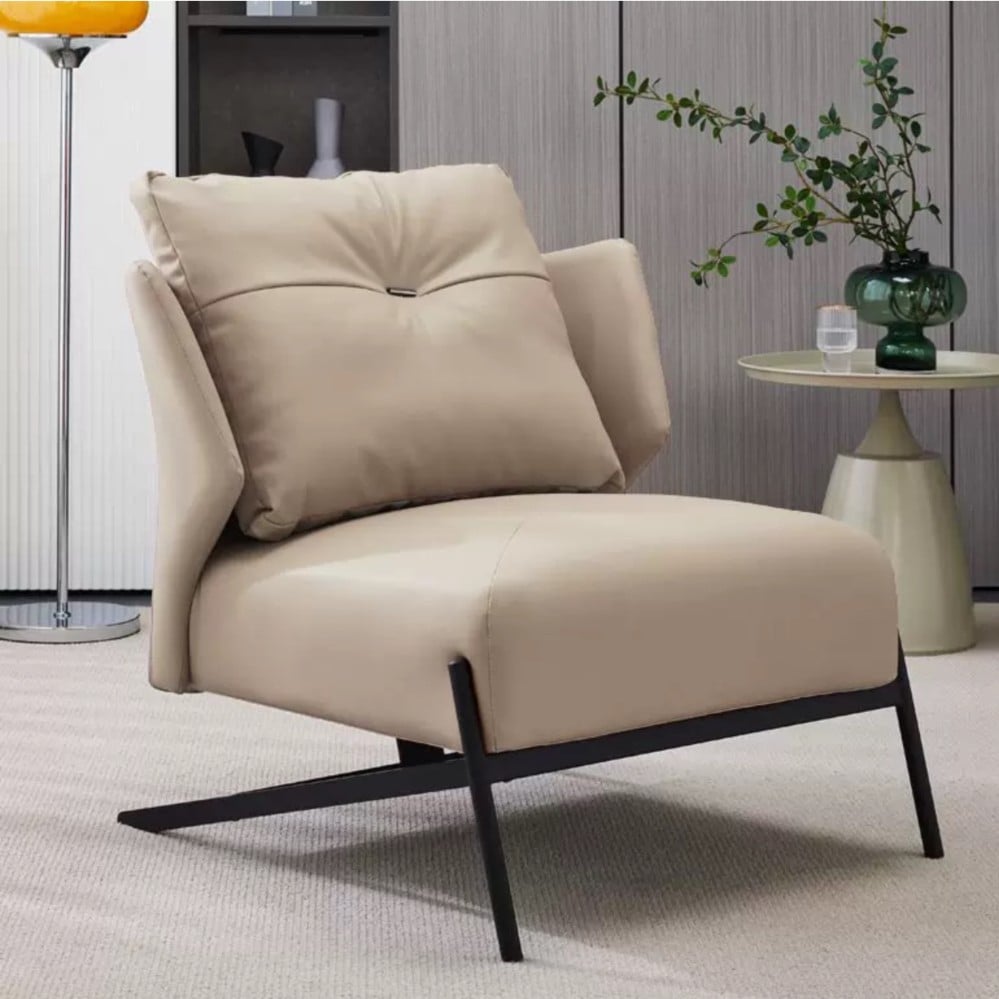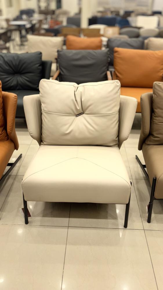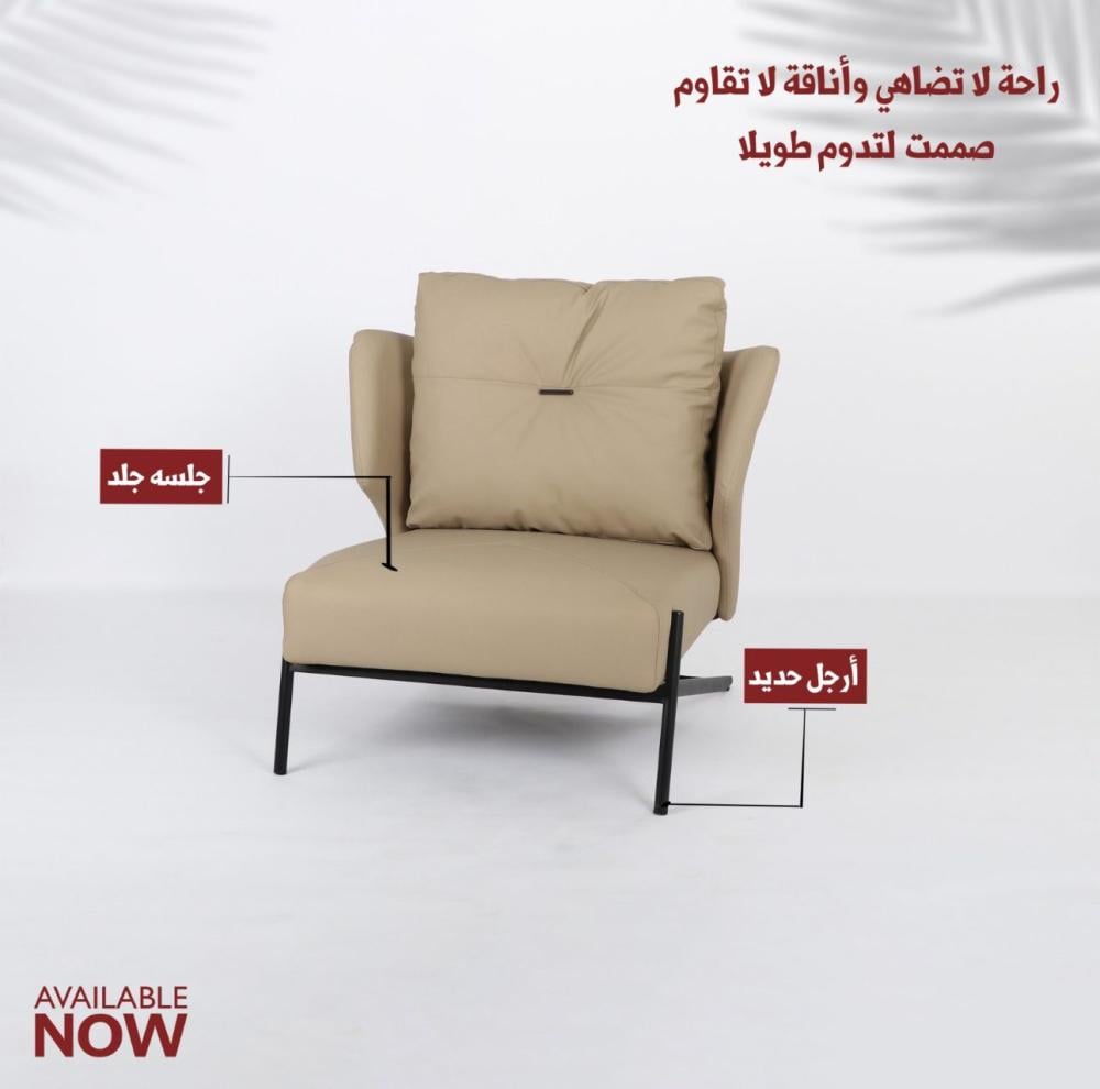 كرسي بحجم كبير مصنوع من الجلد الطبيعي المقاوم للاهتراء ومبطن بطبقة سميكة وناعمة من الإسفنج لتوفير أعلى درجات الراحة أثناء الجلوس، هذا الكرسي مصمم بارتفاع منخفض ومزود بحامل معدني مميز بتصميم هندسي بشكل زاوية قائمة يضفي الكثير من التميز على تصميم الكرسي للابتعاد عن تصاميم الكراسي التقليدية.