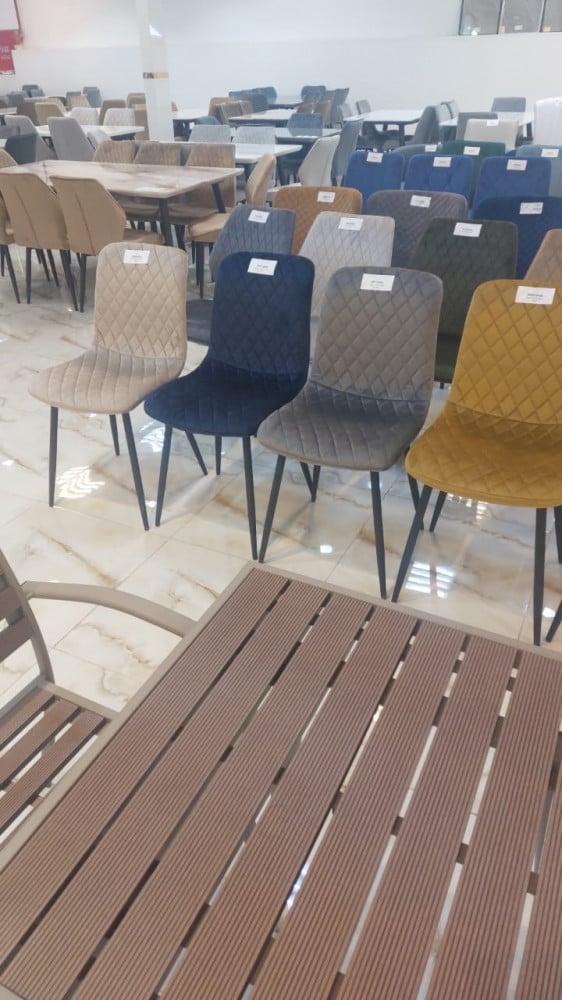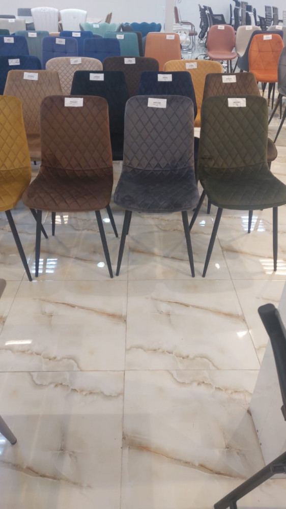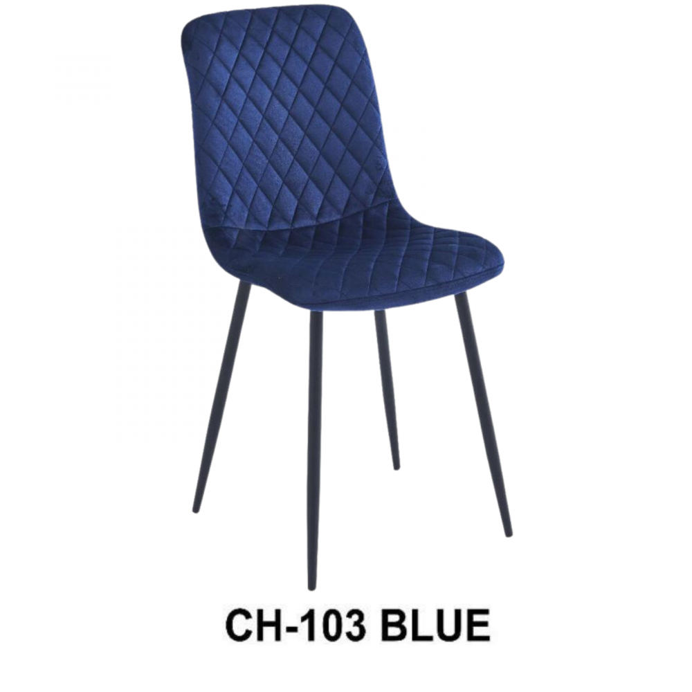 كرسي طعام مصنوع من أجود أنواع المخمل الفاخر بتصميم مزين بدرزات بشكل معينات متجاورة لإضافة لمسة من الأناقة، ومزود بأرجل من الحديد المتين المقاوم للاهتراء والكسر لسنين طويلة، هذا الكرسي مناسب لطاولة الطعام أو لغرف الانتظار ومكاتب العمل.
