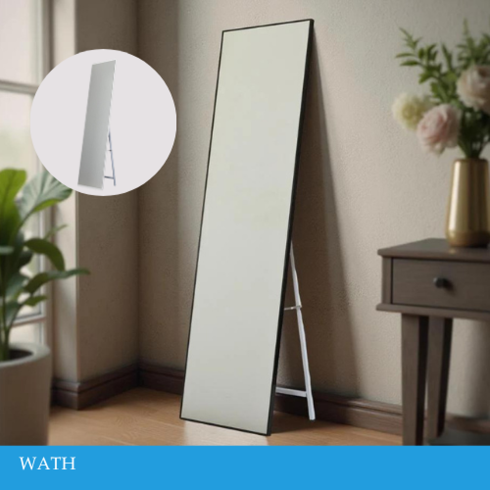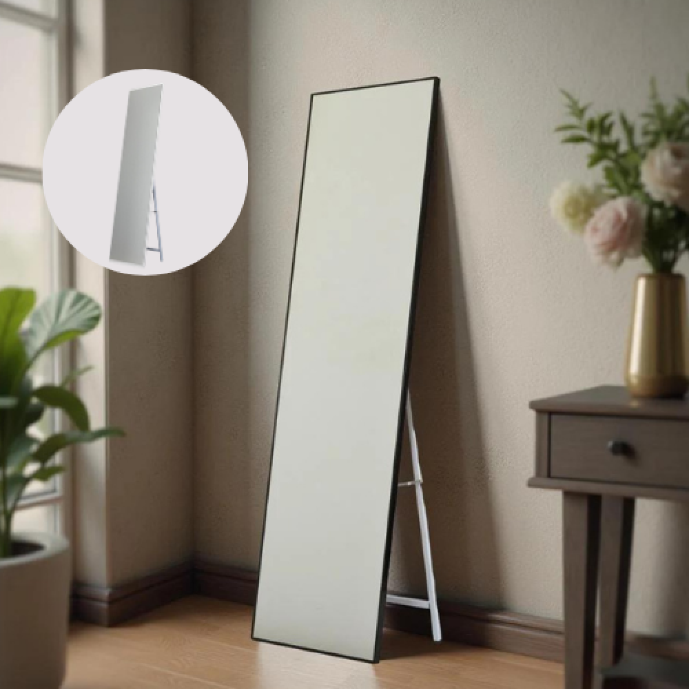 مرايا ستاند بتصميم مودرن أنيق، تجمع بين اللونين الأسود والأبيض لتضفي لمسة جمالية وعصرية على أي مساحة، مثالية لغرف النوم أو المداخل أو غرف الملابس.