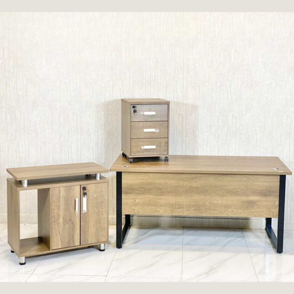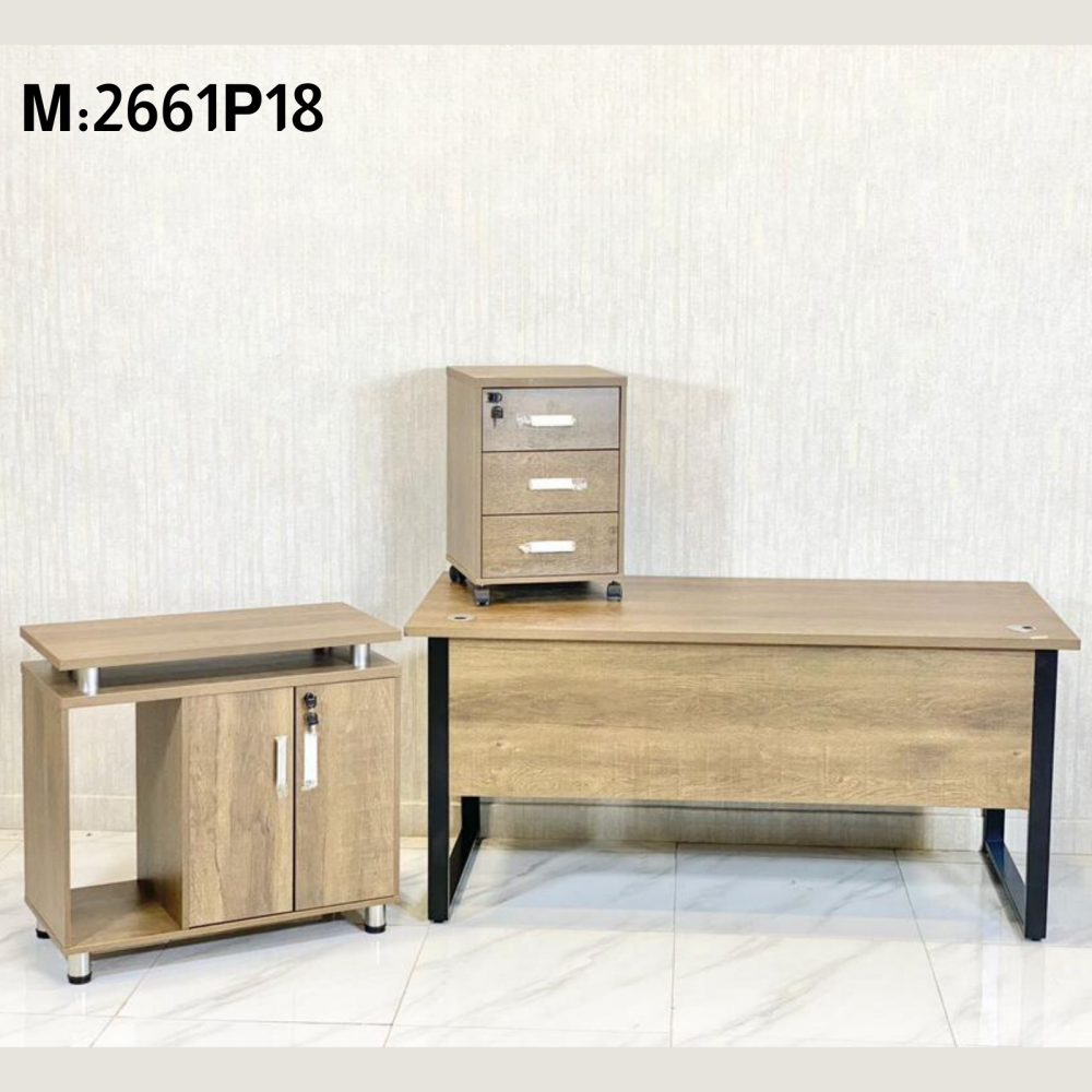 لمحبي الستايل الكلاسيكي في اختيار ديكور مكتب العمل نقدم لكم طقم طاولة مع سكرتاريا وكوميدينة مصنوع من أجود المواد المقاومة للخدش والاهتراء، تتميز الكوميدينة بخزانة مع قفل ورف مخصص لوضع جهاز الكومبيوتر، أما الكوميدينة فهي مؤلفة من ثلاثة أدراج لوضع الأوراق ومستندات العمل الهامة.