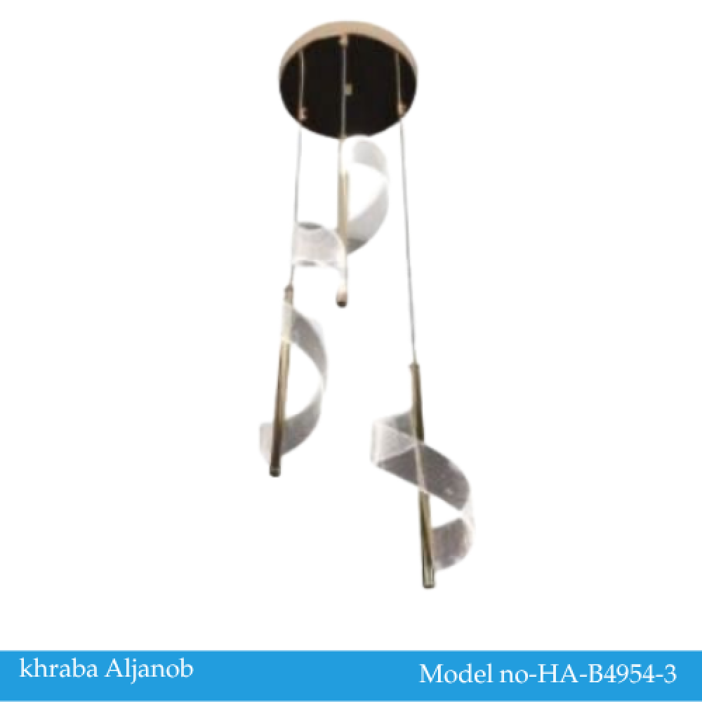 إضاءة LED معلقة بتصميم فاخر يجمع بين الأناقة والابتكار، تأتي بثلاث وحدات إضاءة متدلية مع لمسة لولبية فنية تضيف للمكان شكلاً معمارياً فريداً من نوعه. تضفي مظهراً عصرياً راقياً على أي مساحة داخلية، سواء كانت غرفة معيشة، صالة استقبال، أو حتى مجلس رسمي.