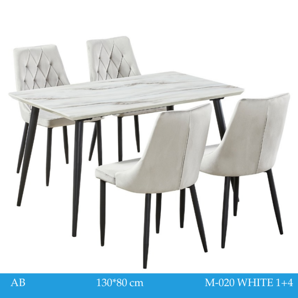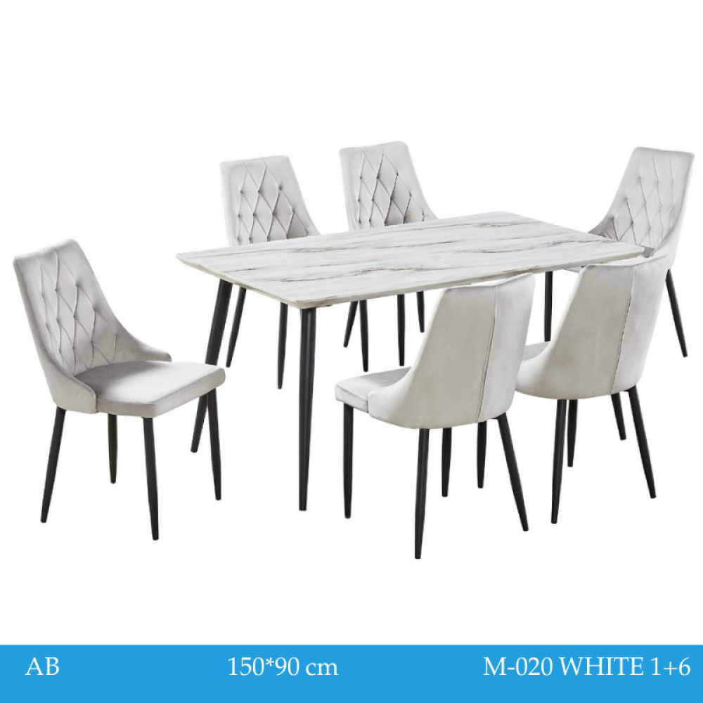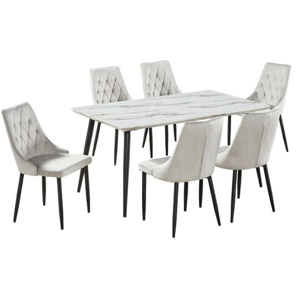 طقم طاولة طعام مؤلف من طاولة مزودة بتصميم مستطيل وحواف منحنية تضفي لمسة من الانسيابية للتصميم، الطاولة مصنوعة من بديل الرخام المزين بتموجات لونية انيقة، بالإضافة لمجموعة من الكراسي المصنوعة من أجود الخامات المريحة، الطاولة والكراسي مزودة بأرجل معدنية مطلية باللون الأسود.