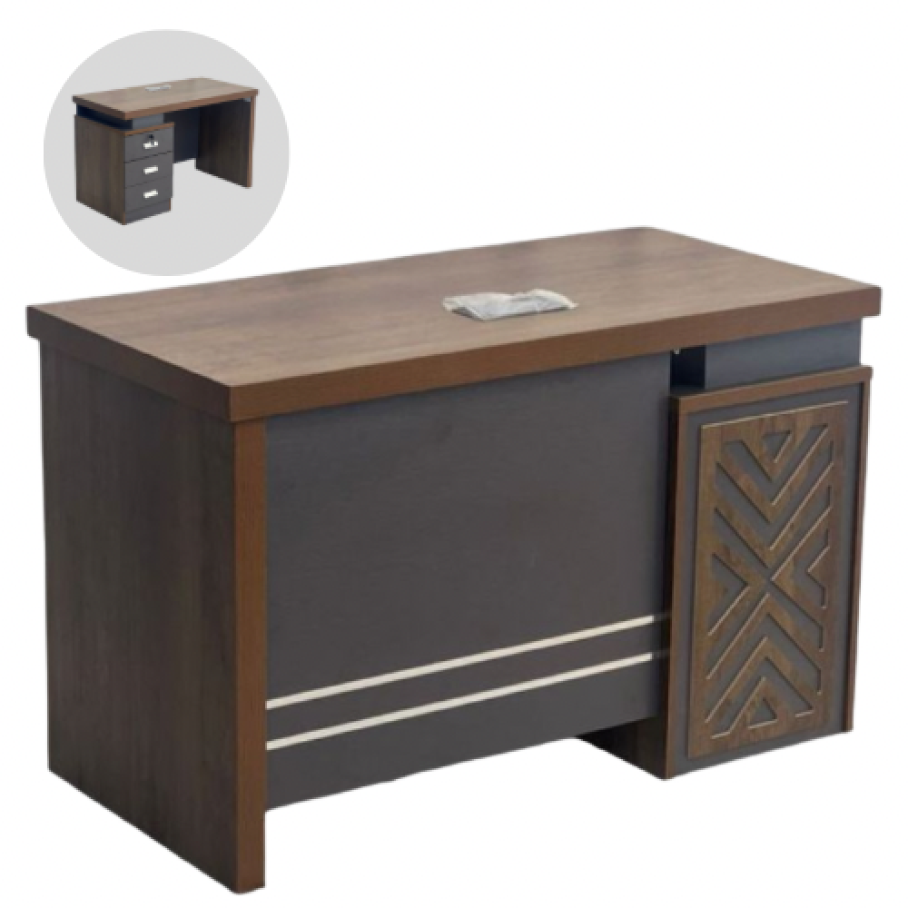 يتميز التصميم بلمسة نهائية خشبية داكنة مع تفاصيل باللون الرمادي، ويشتمل على لوحة جانبية مزخرفة تضيف لمسة جمالية.