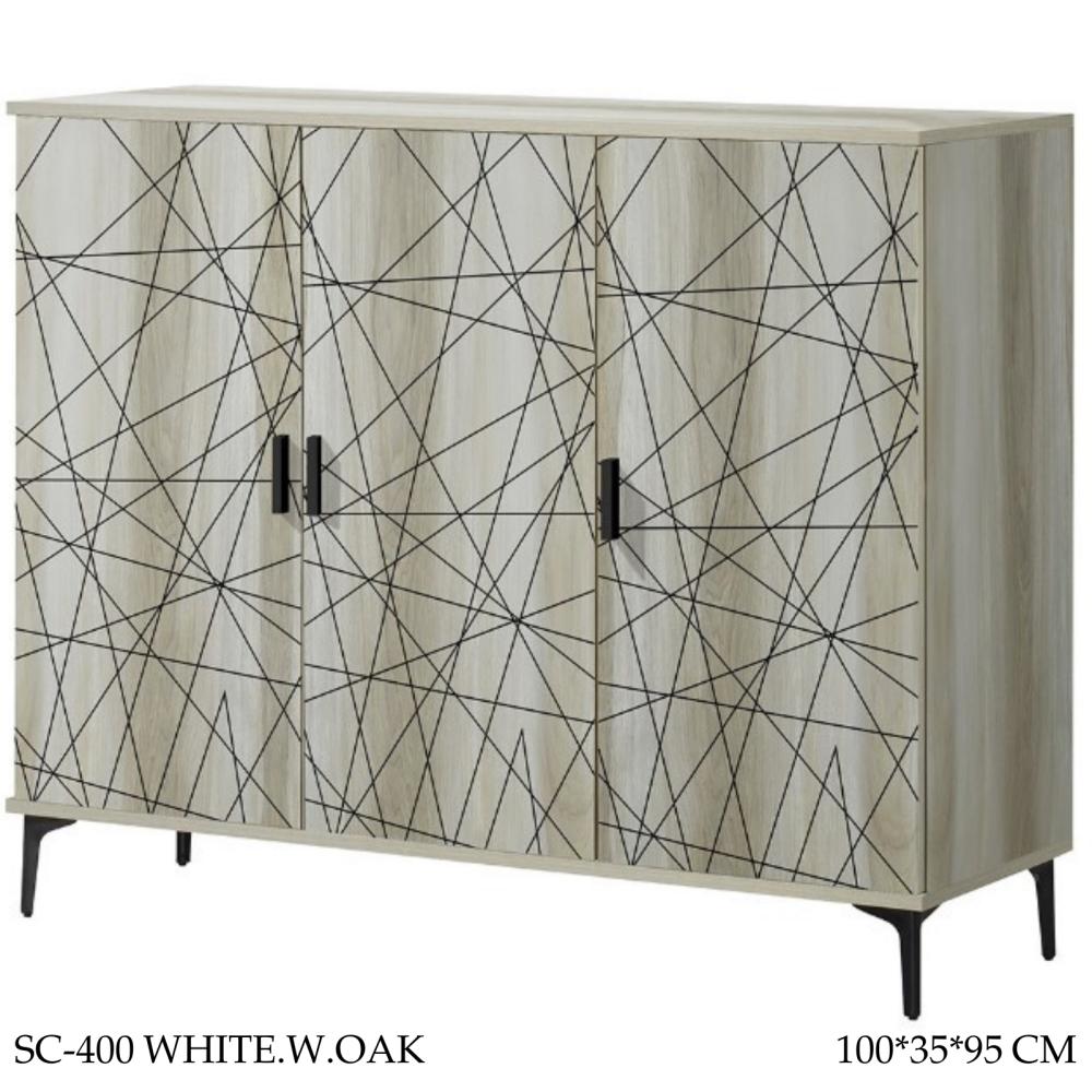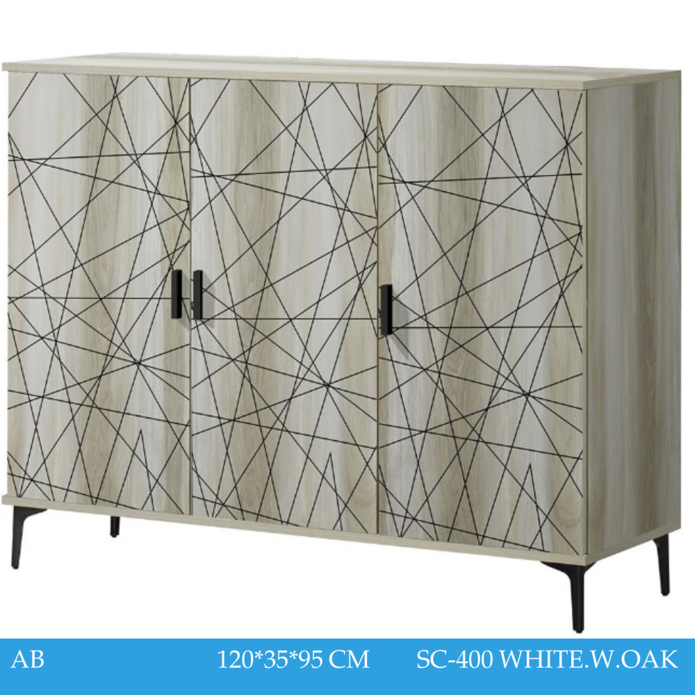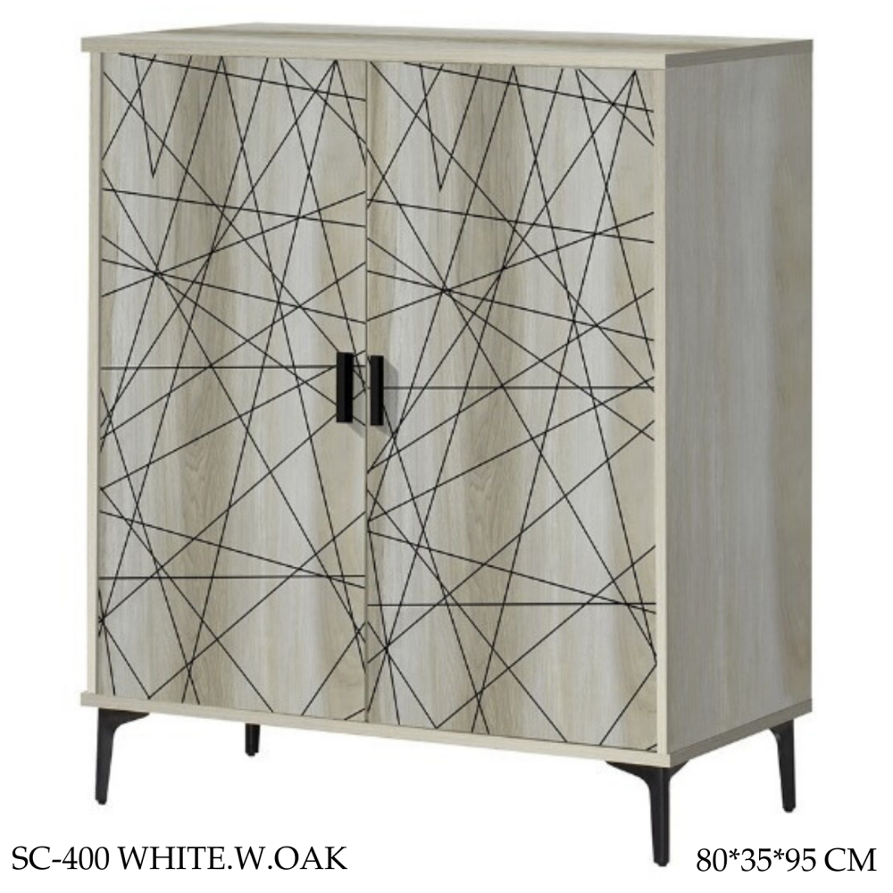 A distinctive wardrobe with a modern design that adds a touch of modernity to the decor of the home entrance or dining room. It is equipped with several internal shelves that provide ample storage space. The doors are decorated with intertwined curved lines that add a touch of distinction to the design. The wardrobe is supported on four sturdy metal legs painted in black.